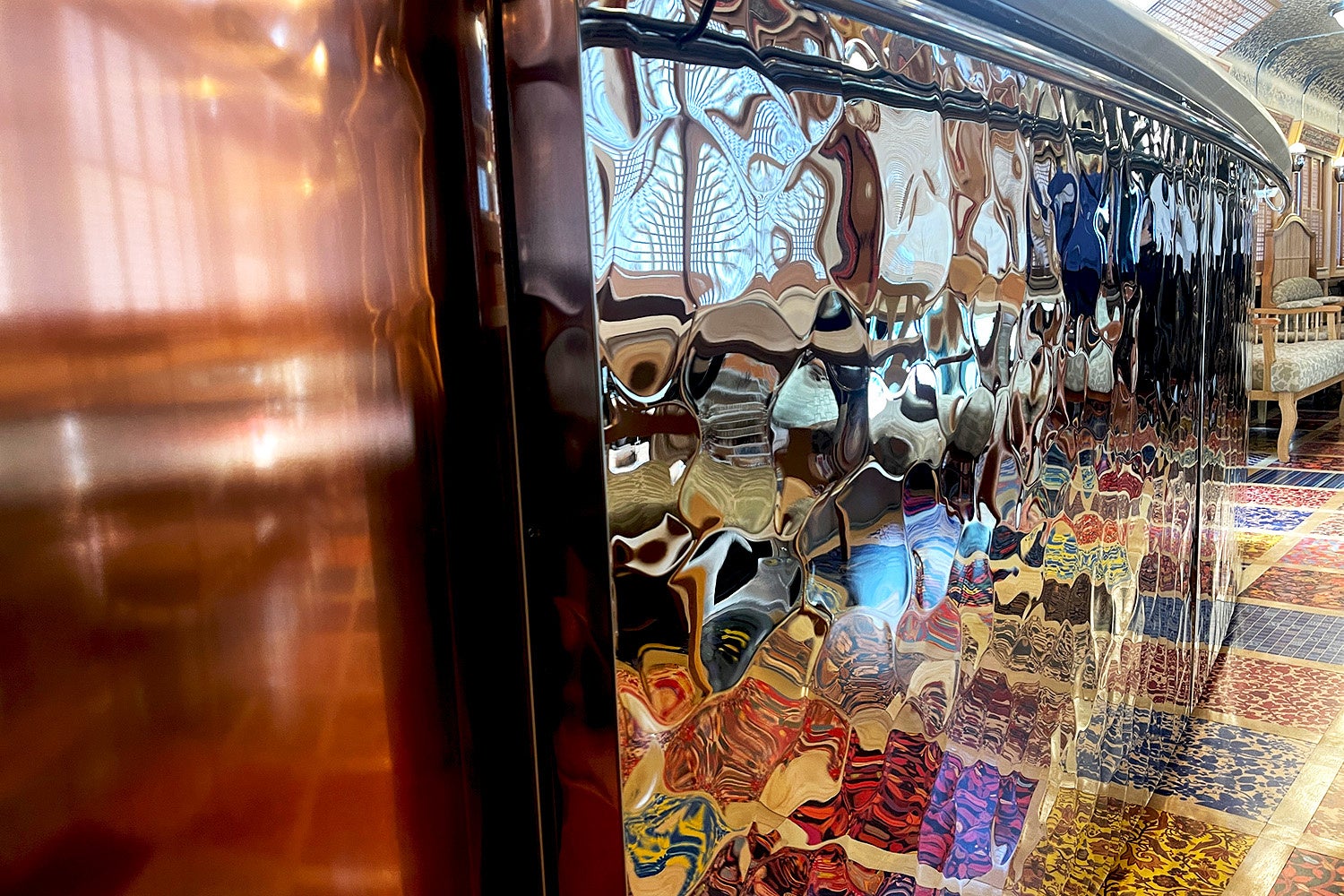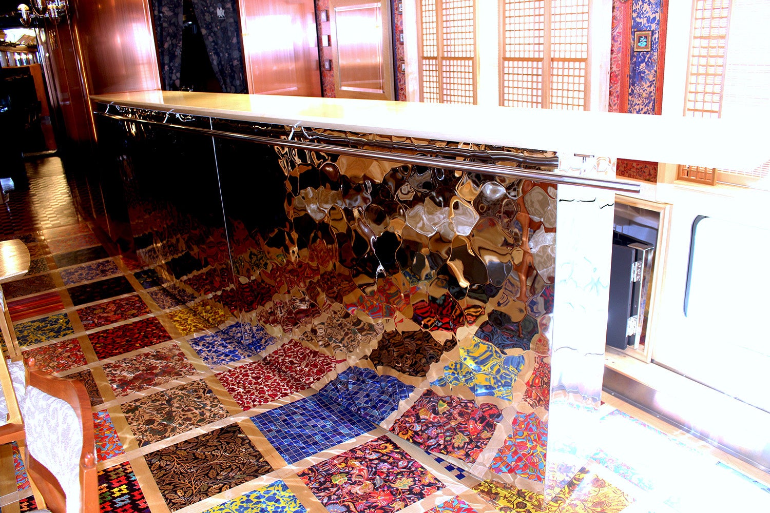 ステンレス鋼の魅力はその美しい輝きと周囲の風景を写し込む金属鏡の反射と投影にあります。 海際を疾走する車窓から見える大村湾の煌びやかな海原を3Dステンレスで表現しています。 ミステリアスミラーパネルリップルスは社内のゴージャスで色とりどりの装飾を写し込み車窓から見える海原との共演でエレガントな社内を演出することに貢献しております。 ドーンデザイン研究所 水戸岡先生の絶妙な曲線美をミステリアスミラーで覆うように施工しています。 機械で仕上げることのできない職人技が光る手仕事です。