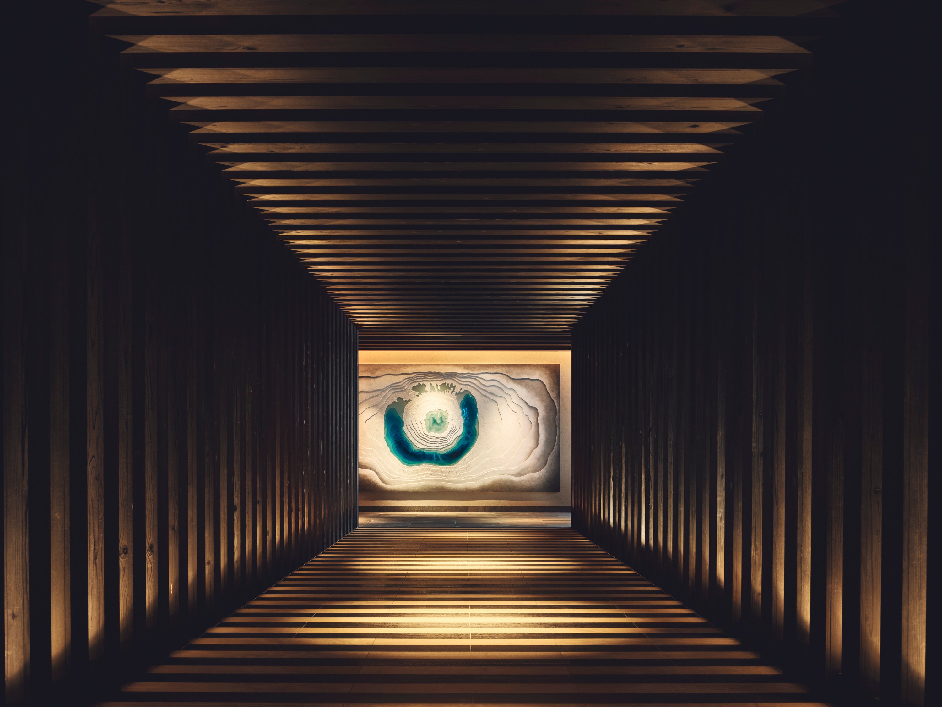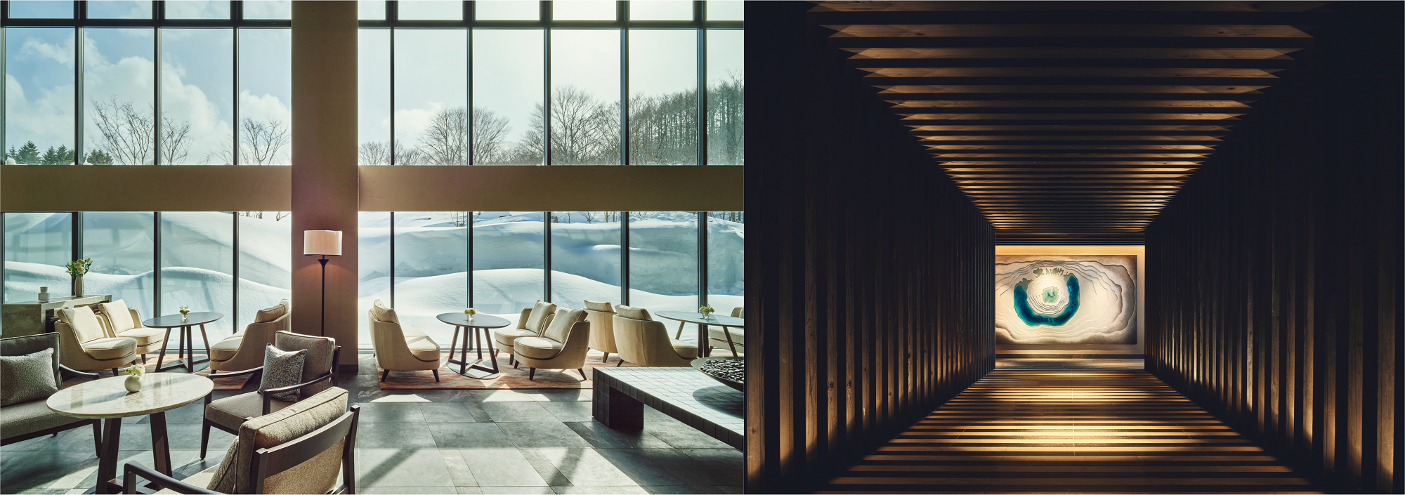 クラブインターコンチネンタルを象徴するとっておきのエクスペリエンスのひとつがクラブラウンジです。ホテルエントランスに到着したお客様は、深い森を彷彿させる、ほの暗い廊下を通って別世界へと誘われます。まず目を惹くのは、八幡平の頂上付近であらゆる自然条件が一致したときだけに「開眼」する、幻の絶景「ドラゴンアイ」をモチーフにしたアート作品。奥深いブルーと真っ白な雪、それが溶けて露呈した土を表現したグラデ―ションの中に吸い込まれるように進み、自然光が燦燦と降り注ぐクラブラウンジへとエスコートされます。