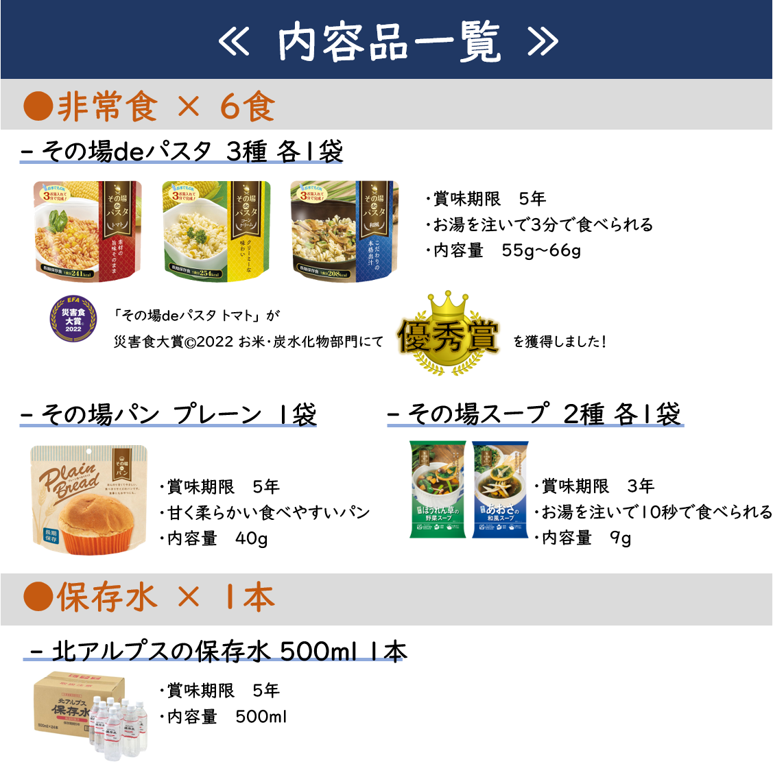 内容品 非常食×3食/保存水500ml×2本/災害用トイレ×5回分/アルミシート×1枚/防災対策カード