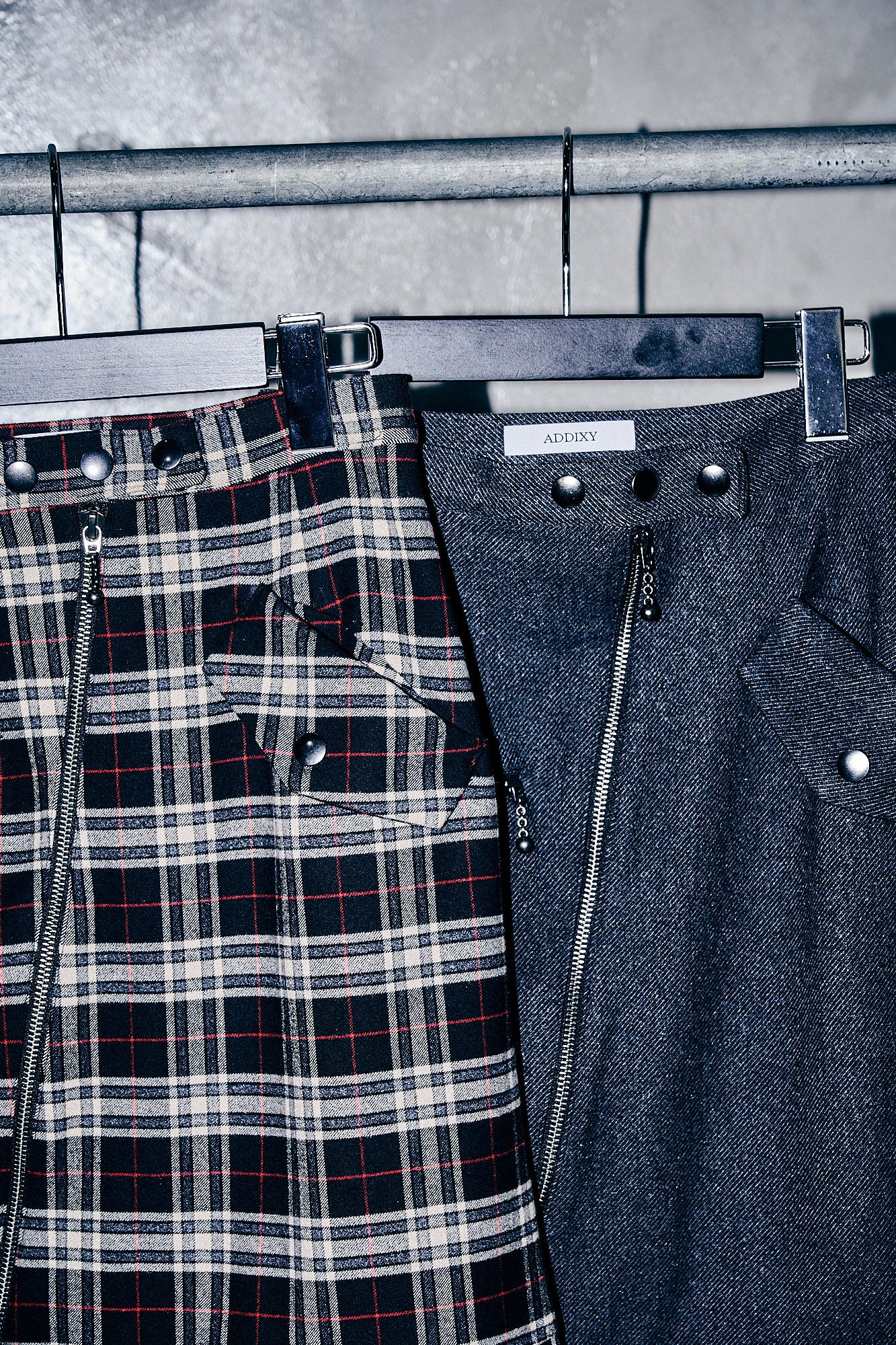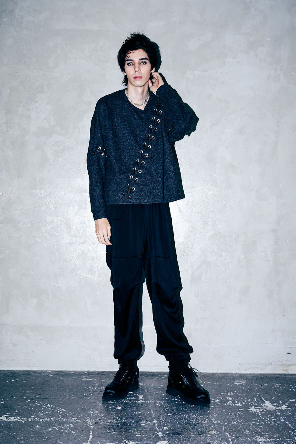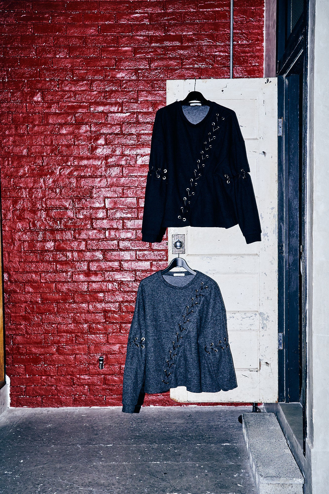レザーとイタリア産のリサイクルウールを組み合わせたアウターやライダースライクなデザインを施したフレアスカート、レザー紐のレースアップとハトメデザインでエッジを効かせたラムウール混のニットなど、エッジの効いたデザインでありながら、生地感や着心地にもこだわった日本製の上質なアイテムを中心に展開いたします。