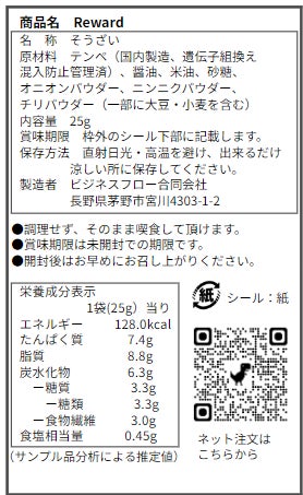 毎日の食事・お弁当のご飯にふりかけたり、運動前後や小腹が空いた時のおやつ、罪悪感の少ないおつまみ、として手軽に摂取できる「Reward」は、忙しい日常でもすぐに取り入れられる便利なアイテムです。調理油の劣化を防ぐためにアルミ層のある袋で遮光し、脱酸素剤を袋に同封しています。持ち運びしやすい食べきりサイズです。