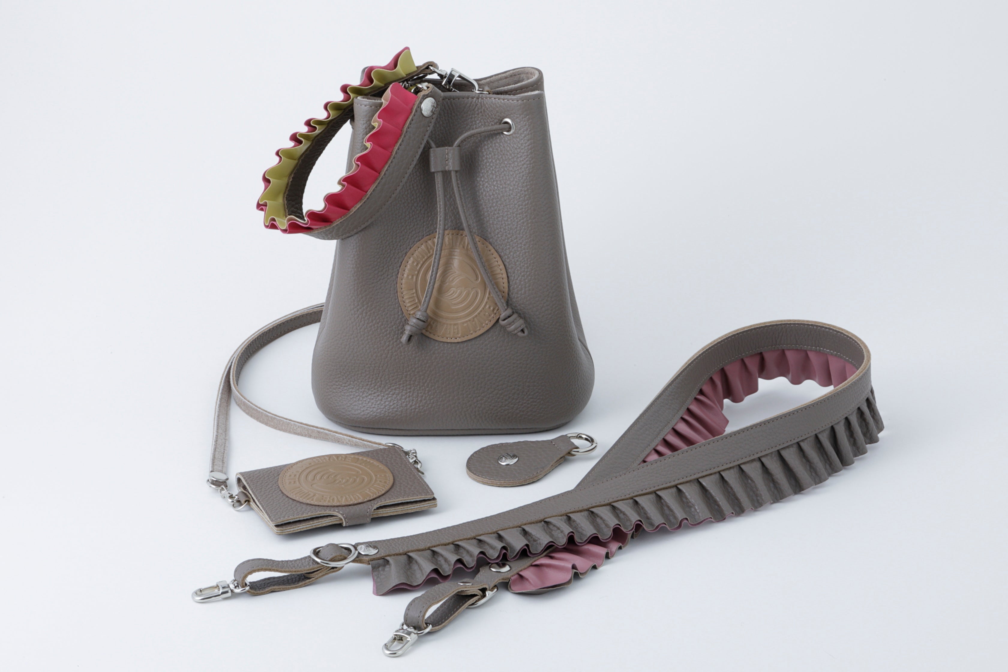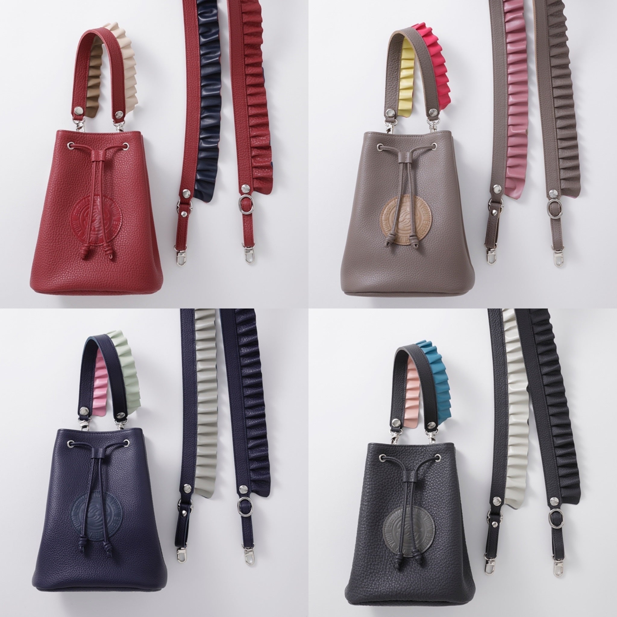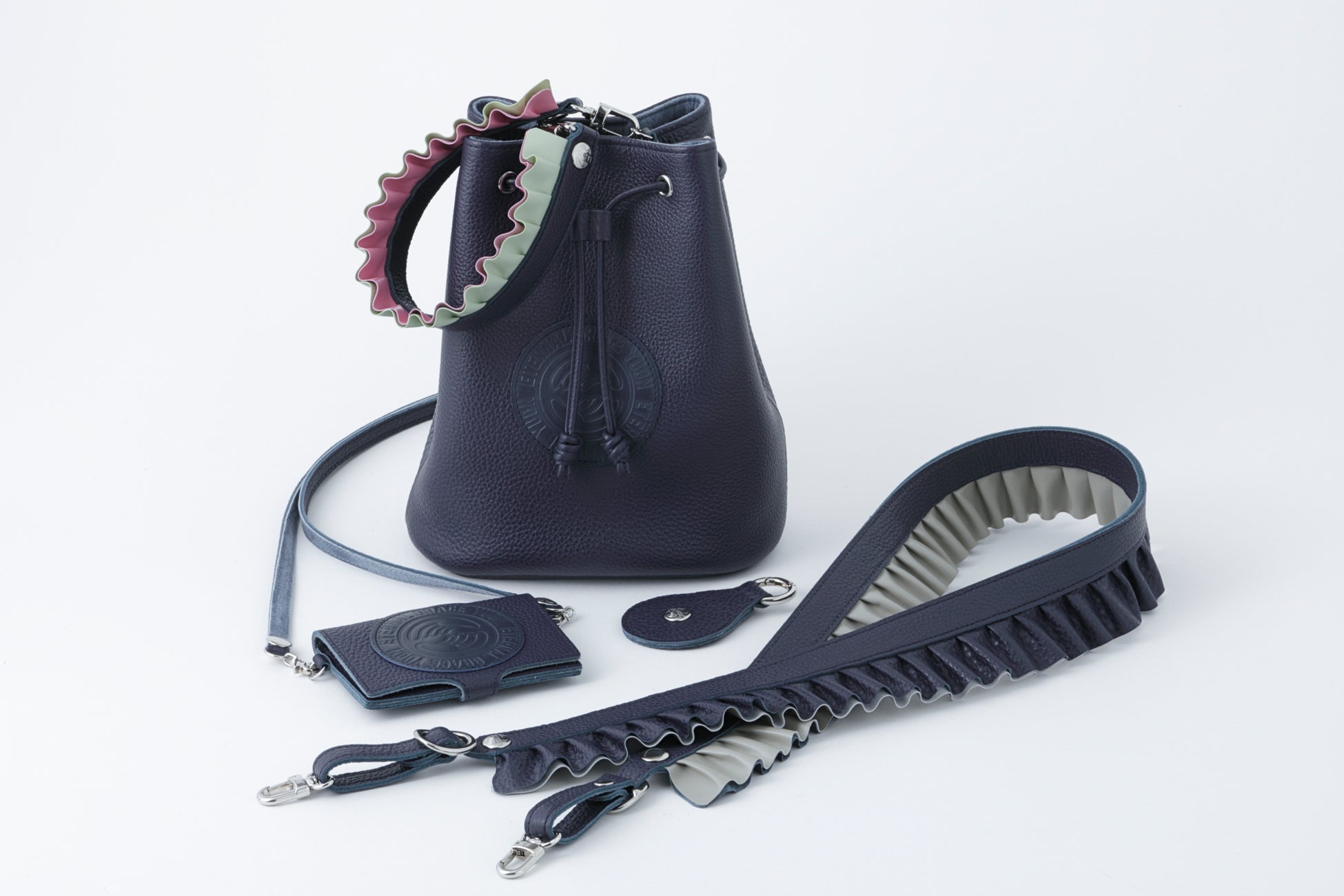 カラフルな質感の違う牛革がアクセントになり、ハンドルとショルダーはリバーシブル。