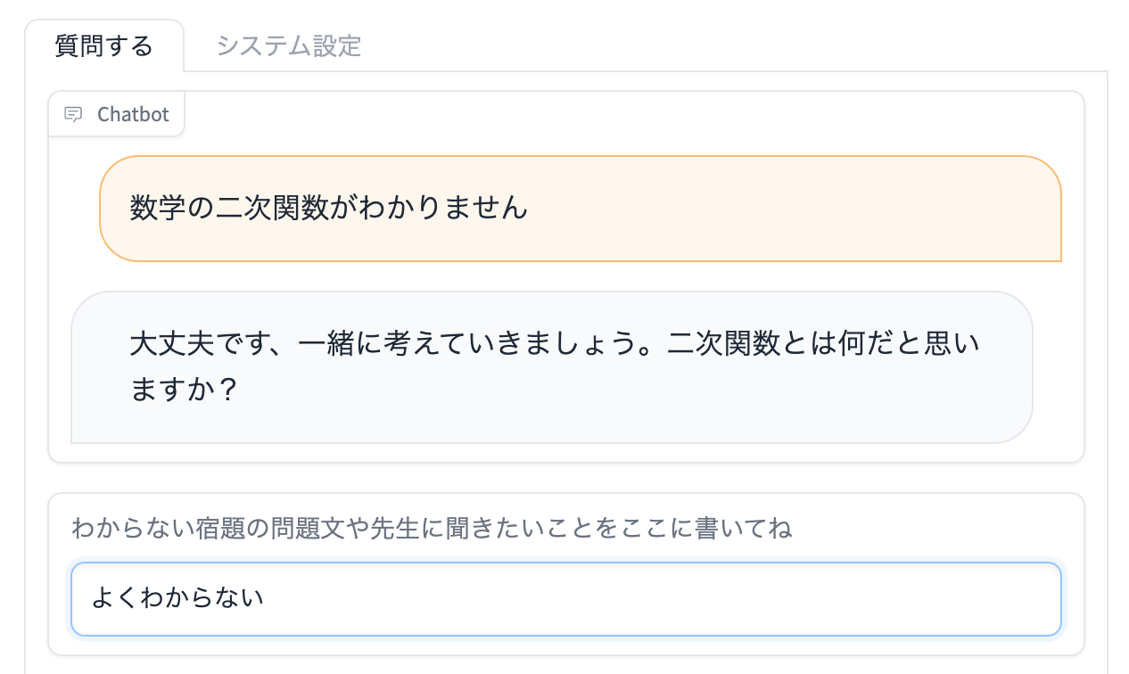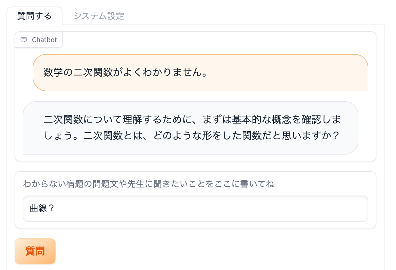 AI家庭教師 -AI Tutor Plus-は、本物の先生のような人間味あふれる対応で、生徒たちの学習をサポートする革新的なAI家庭教師サービスです。ChatGPT(GPT-4)を活用し、数学をはじめとする様々な科目に対応し、既存の教育システムへも簡単に組み込むことができます。