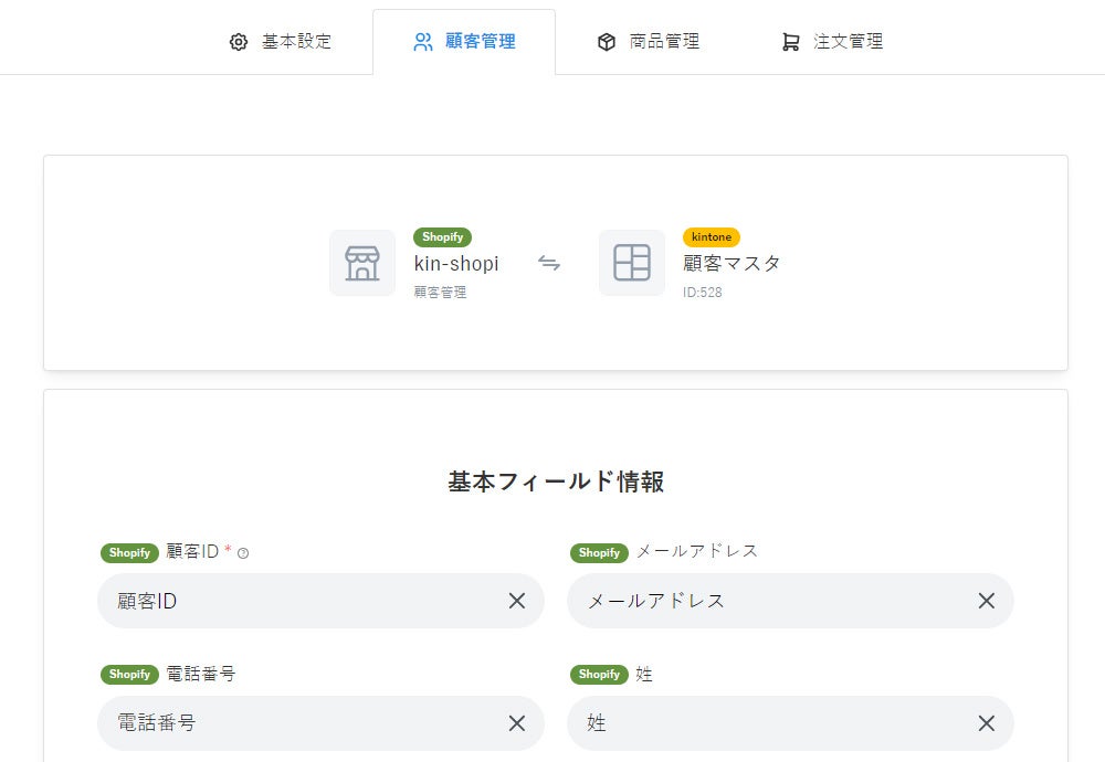 Shopify→kintoneの基本フィールドのみ連携 |