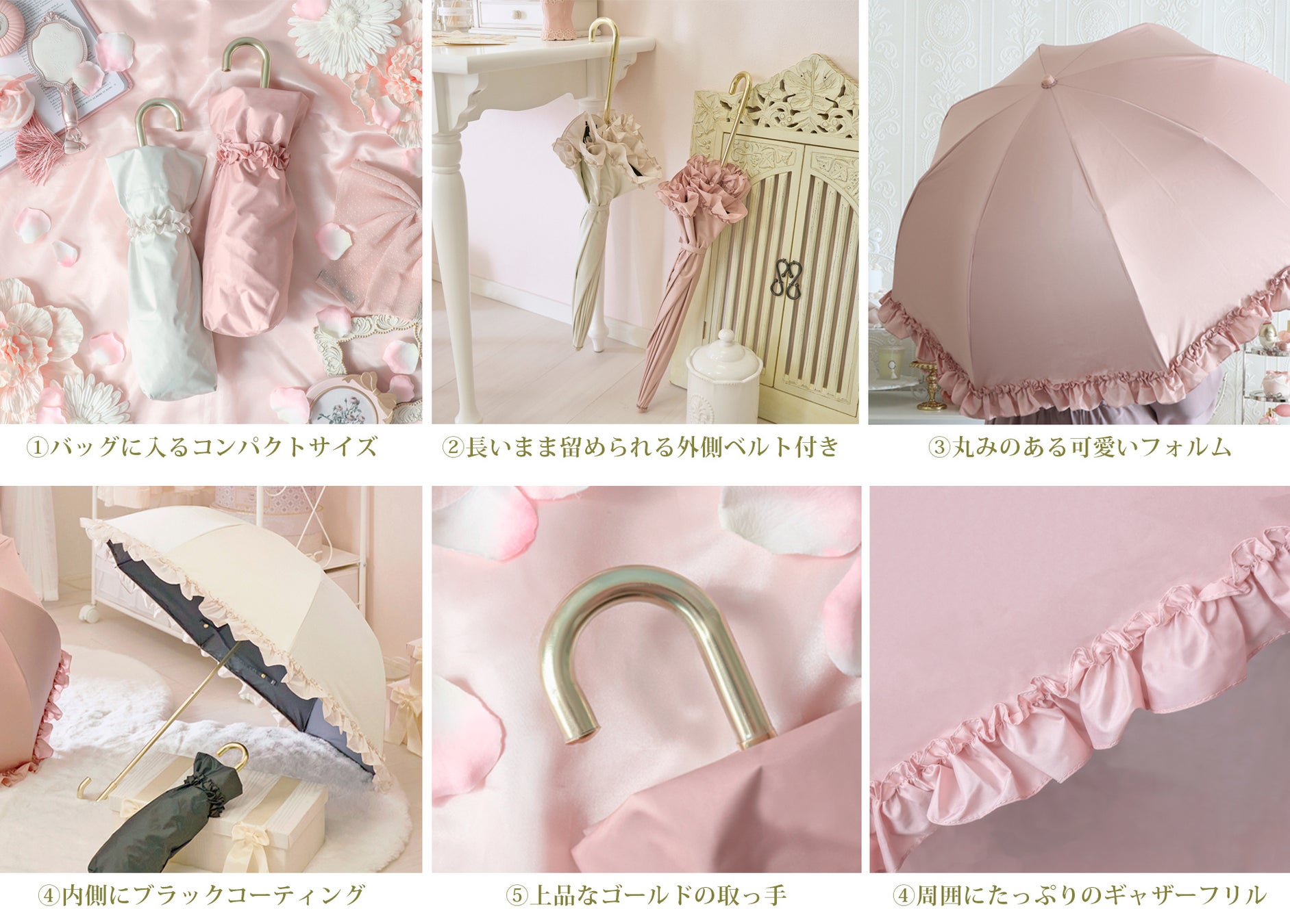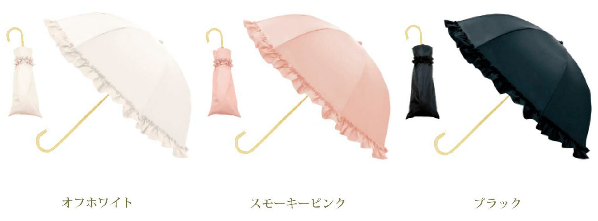日傘を広げた時に丸みのある女性らしいシルエットになるよう、デザインにこだわりました。また日傘のふちにはたっぷりのギャザーフリルをあしらい、ロマンティックで可愛いデザインになっています。持ち手の色は上品さを感じるゴールドを採用し、フラットな握り心地で女性の手になじみやすいコンパクトなサイズ感になっています。