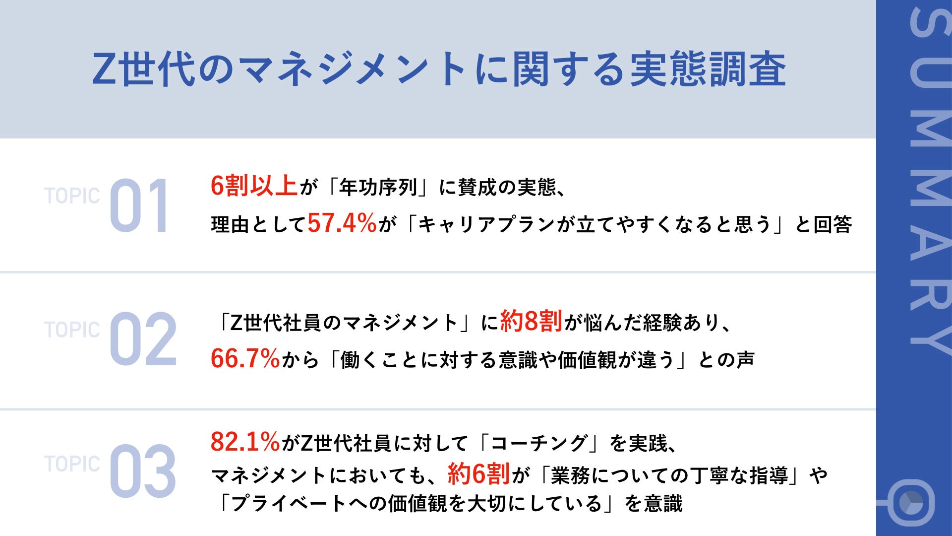 Z世代のマネジメントに携わる中間管理職の6割以上が「年功序列」に賛成しており、理由として「キャリアプランが立てやすくなると思う」や「評価基準がわかりやすくなる」が最も多い意見でした。また、約8割が「Z世代社員のマネジメント」に悩んだ経験を持ち、主な要因としてZ世代は「働くことに対する意識や価値観が違う」という声が多数挙がりました。