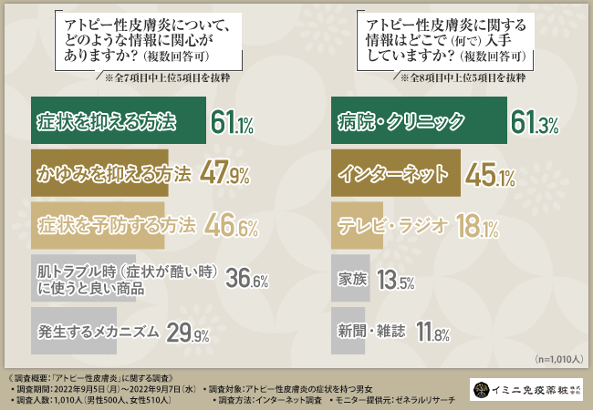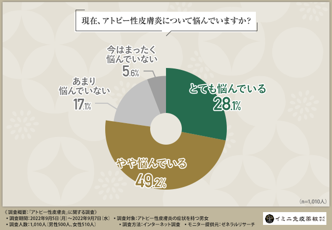 イミニ免疫薬粧株式会社(本社所在地:東京都中野区、代表取締役:泉 奈越子)は、アトピー性皮膚炎の症状を持つ男女を対象に、「アトピー性皮膚炎」に関する調査を実施しました。