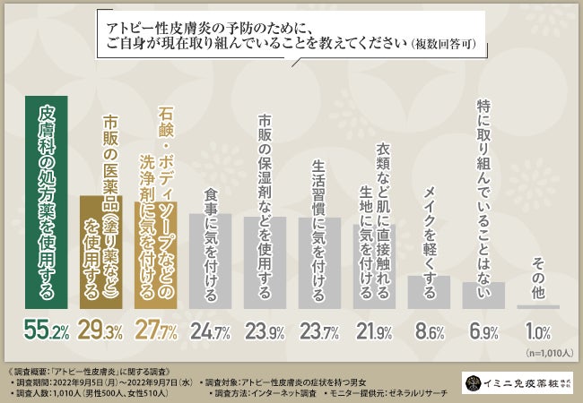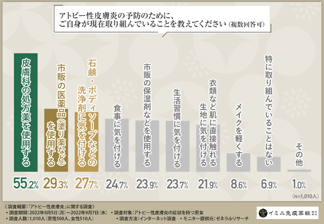 そこで、「アトピー性皮膚炎の予防のために、ご自身が現在取り組んでいることを教えてください(複数回答可)」と質問したところ、『皮膚科の処方薬を使用する(55.2%)』という回答が最も多く、次いで『市販の医薬品(塗り薬など)を使用する(29.3%)』『石鹸・ボディソープなどの洗浄剤に気を付ける(27.7%)』『食事に気を付ける(24.7%)』『市販の保湿剤などを使用する(23.9%)』と続きました。