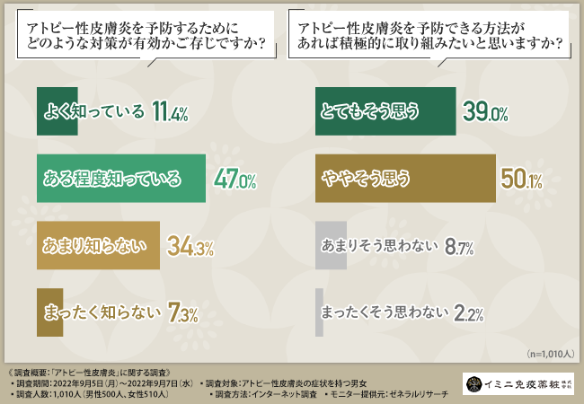 よく知っているという方は1割程度にとどまり、4割以上の方がアトピー性皮膚炎の予防に有効な対策をご存じないことが分かりました。