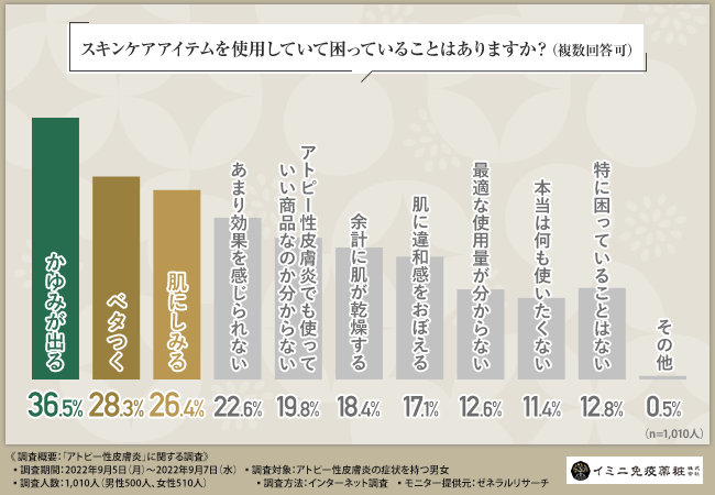 - 【アトピー性皮膚炎はスキンケアにも悩みをもたらす】スキンケアアイテムの使用で困っていることとは