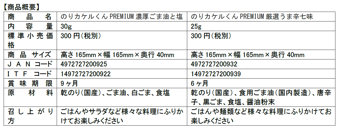 のりカケルくんシリーズにPREMIUM版が新登場!【濃厚ごま油と塩味】【厳選うま辛七味】が9月1日発売