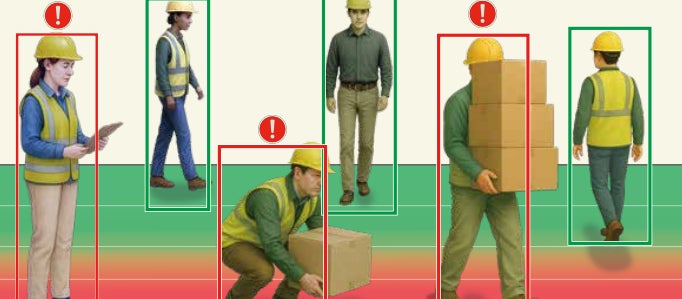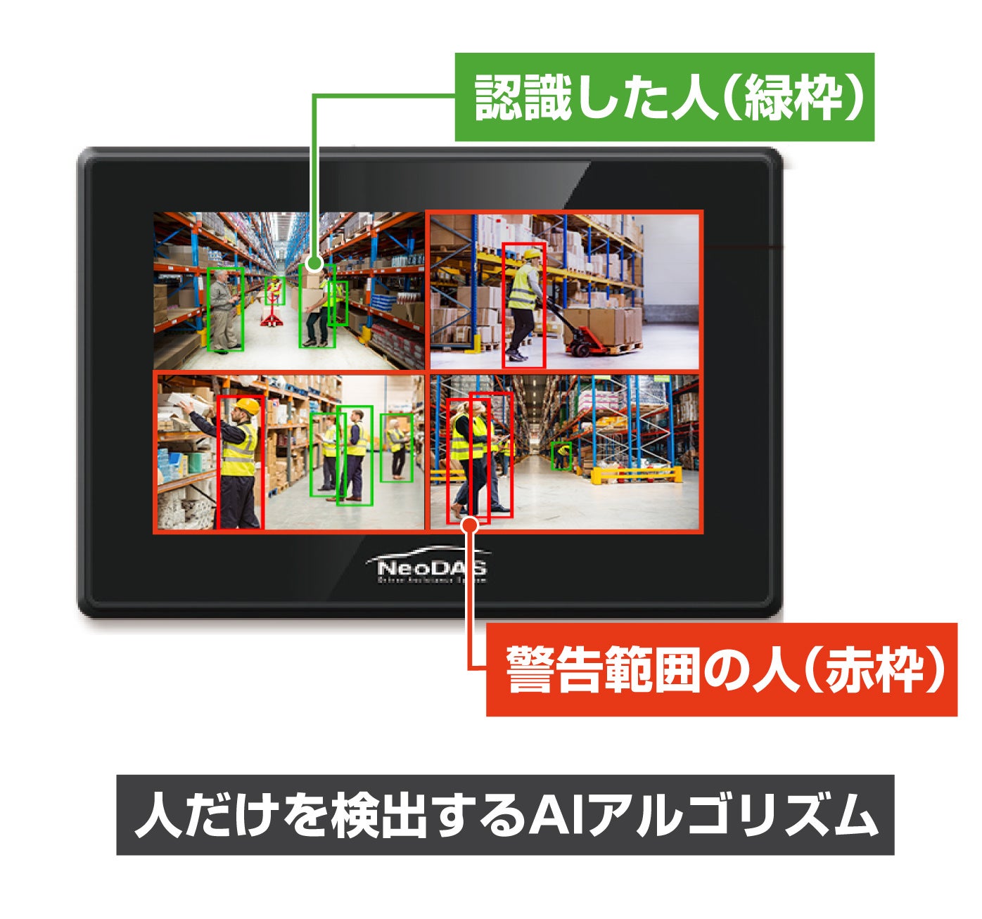 独自に開発したディープラーニング技術に基づき、リアルタイムで人を検知。立っている人だけでなく、しゃがんでいる人や後ろ姿の人など、さまざまな体勢を正確に認識し、危険を警告します。