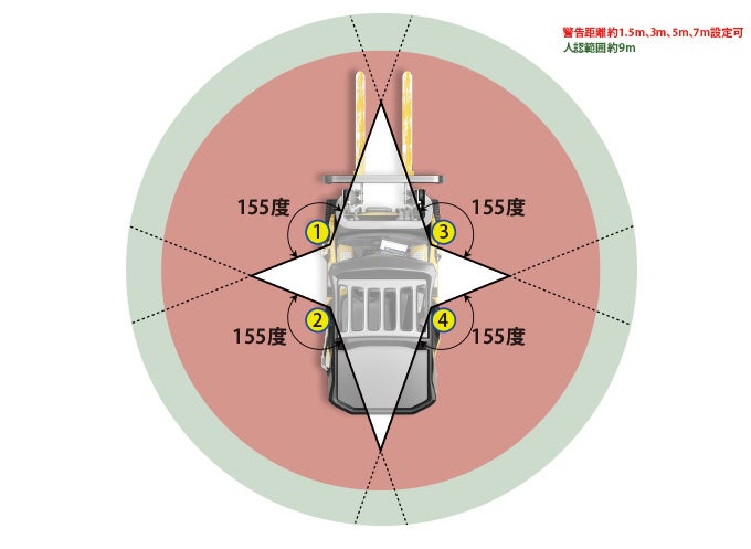 専用の小型カメラは水平視野角約155°を誇り、車両の4隅に設置することで死角のない360°の監視を実現します。認識距離は最大約9mで、警報範囲は現場の状況に合わせて7m、5m、3m、1.5mに設定できます。さらに、バックギア信号やブレーキ信号と連動し、より正確かつ効果的に危険を警告します。