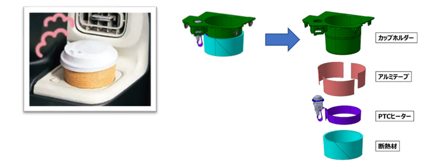 ・ 樹脂成形のカップホルダーと、側面に巻いたPTCヒーター、熱を拡散させるアルミテープ、熱ロスを減らし効率を上げる断熱材で構成された、軽量かつスペース効率の高い設計 *特許出願中