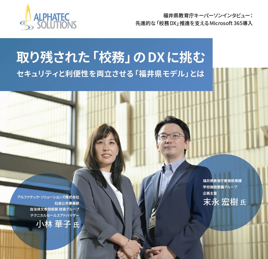 アルファテック・ソリューションズ株式会社(本社:東京都品川区、代表取締役社長:西山 紀明、以下アルファテック・ソリューションズ)は、福井県教育庁がフルクラウドとゼロトラストセキュリティを基本方針に、独自のアプローチで取組みを本格化させた「校務DX」に関する福井県教育庁のキーパーソンインタビュー記事を公開しました。アルファテック・ソリューションズは福井県教育庁の校務系システムの刷新パートナーの一社として、Microsoft 365による教職員向けポータルサイト(SharePoint)や校務系メール/スケジュール(Exchange/Outlook)、オンライン会議/チャット(Teams)の構築・移行、および運用を担当します。