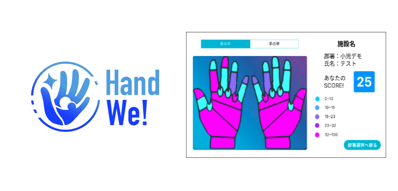 手洗いの結果を点数化し、施設の手洗いレベルを偏差値化する教育ツール「SCORE!」が大幅リニューアル。AIを搭載し、より精度の高い「Hand we!」として新たに生まれ変わりました。