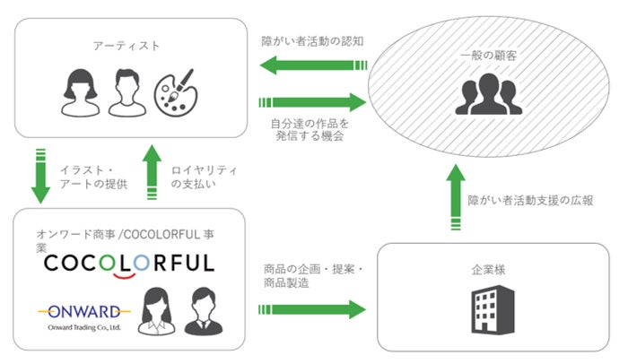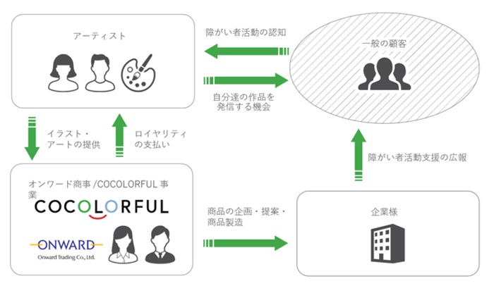オンワード商事株式会社(本社:東京都千代田区 代表取締役社長:村上 哲)は、障がいがある多彩なアーティストの作品を企業向けの商品企画提案に活かすことで、アーティスト活動の認知拡大と支援を目指す新サービス「COCOLORFUL(ココロフル)」を開始しました。