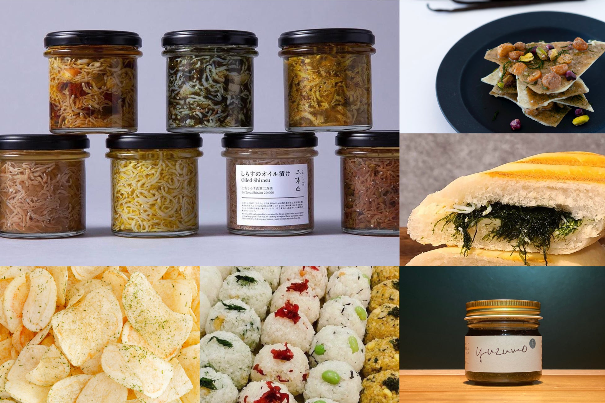 店頭では私たちが栽培・開発する海藻を原料とした商品をご購入いただけるほか、「すじ青のり」を使用したコラボレーション商品を販売。