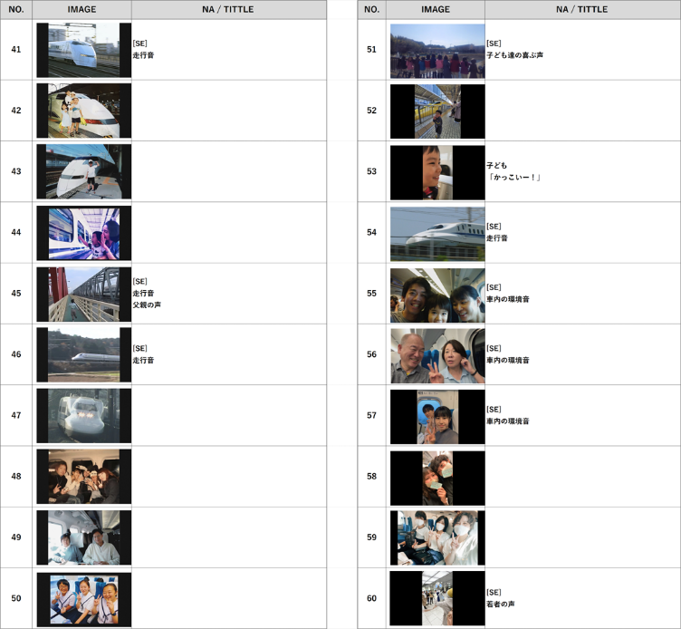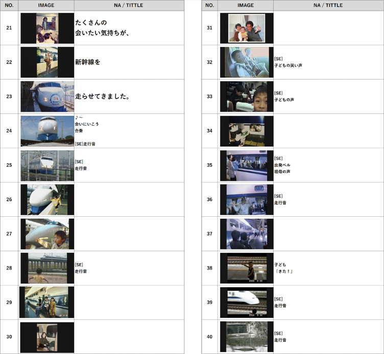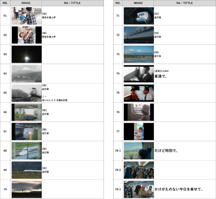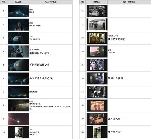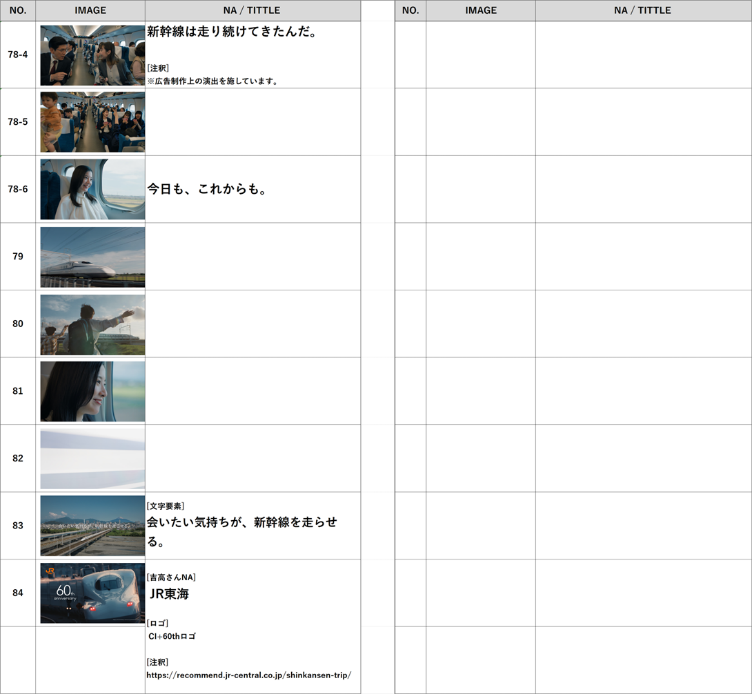 暗がりに並んだ歴代の新幹線を見つめる吉高由里子さんの映像から始まります。「新幹線はこれまで、どれだけの想いをのせてきたんだろう。」吉高さんのナレーションとともに、0系・100系・300系と歴代の車内チャイムが流れます。場面が切り替わり、新幹線が持つ記憶を辿るかのように懐かしの車内風景が映し出され、これまで乗せてきたお客様の思い出を写真や動画で振り返ります。テーマソング「会いにいこう」はゆったりとしたオルゴール調からオーケストラアレンジ、合唱バージョンへと切り替わり、車内風景は徐々に現代へと近づいてきます。修学旅行や家族旅行から出張まで、さまざまな想いを乗せて走り抜いてきた60年を描きました。映像のラストでは、吉高さんが車窓を見つめる様子に、「会いたい気持ちが、新幹線を走らせる。」というメッセージで映像は締めくくられます。「60年分の思い出」が詰まった映像をぜひお楽しみください。