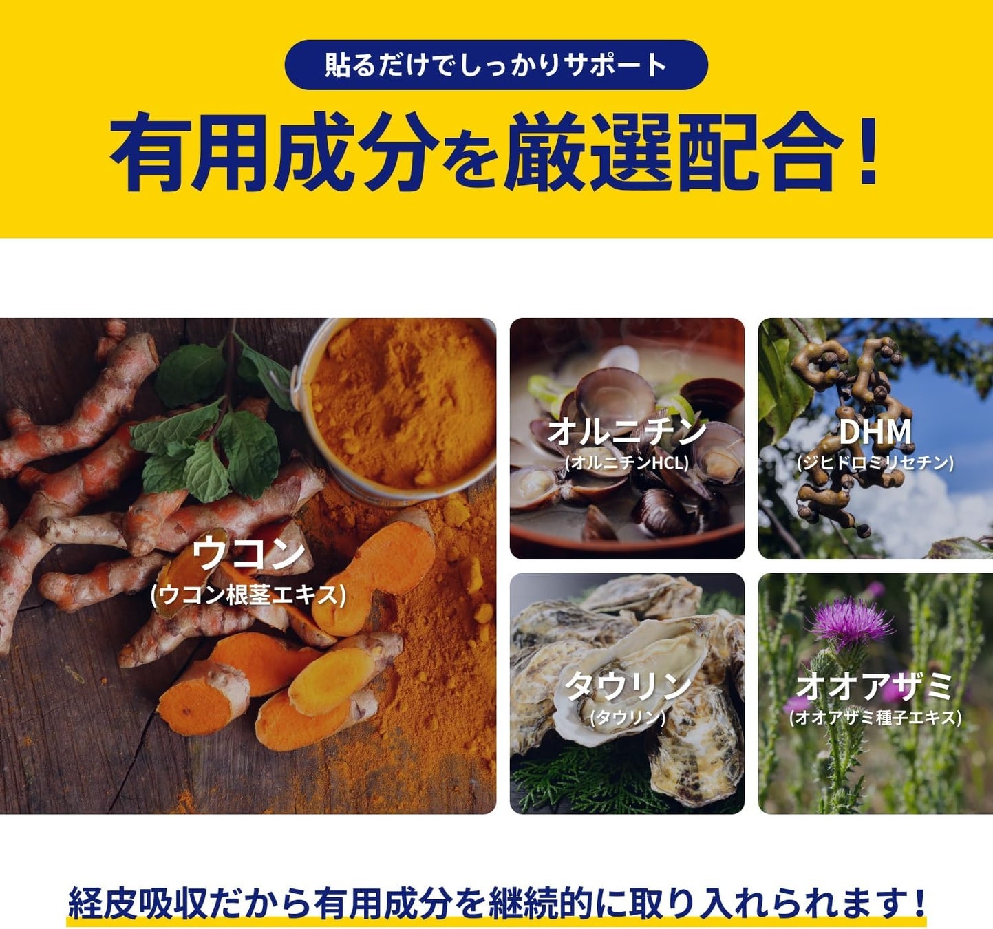一般的に認知度の高い、ウコン※1、オルニチン※2、タウリンに加え、近年欧米にて注目されているDHM※3(ジヒドロミリセチン)、オオアザミ※4を配合。こちらに加え、ビタミンC誘導体※5、グルタチオン、システインなどの有用成分も配合しています。そして、製造は国内製薬会社の国内工場にて、すべて国内生産をおこなっております。(※1 ウコン根茎エキス:保湿成分、※2オルニチンHCl:保湿成分、※3ジヒドロミリセチン:保湿成分、※4オオアザミ種子エキス:保湿成分、※5テトラヘキシルデカン酸アスコルビル:保湿成分)