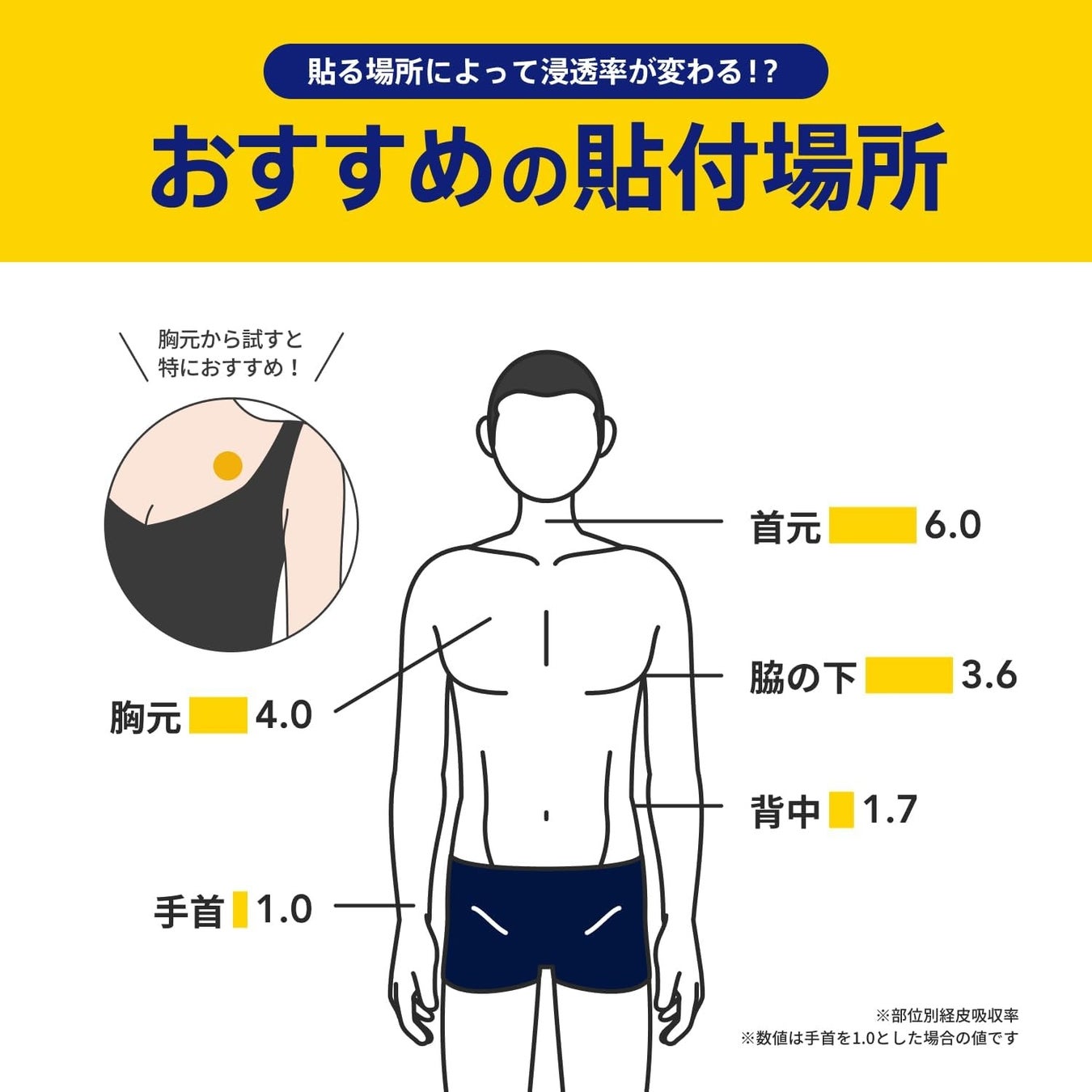 1回1枚、肌に直接貼るだけです。貼る場所は、首元・胸元をおすすめしておりますが、体毛の少ない部分や、関節の動きなどの少ない部分であれば、どこに貼っても問題ありません。また、使用時間の推奨は約6〜8時間となります。