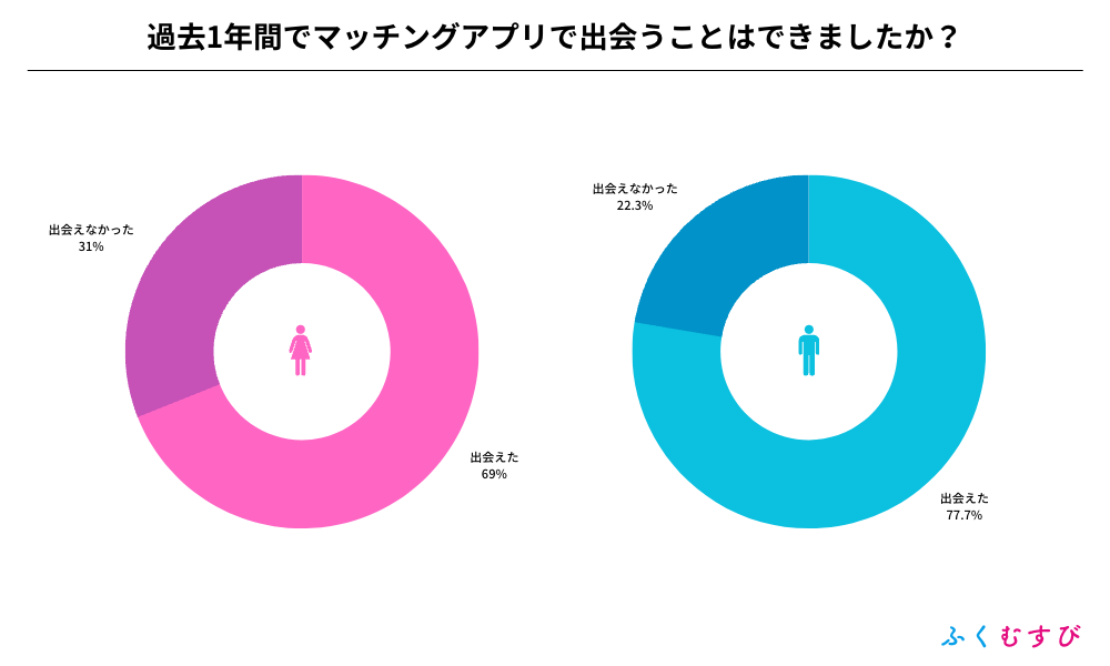 ・マッチングアプリで異性と出会えた割合は、男性が77%、女性が69%となりました。