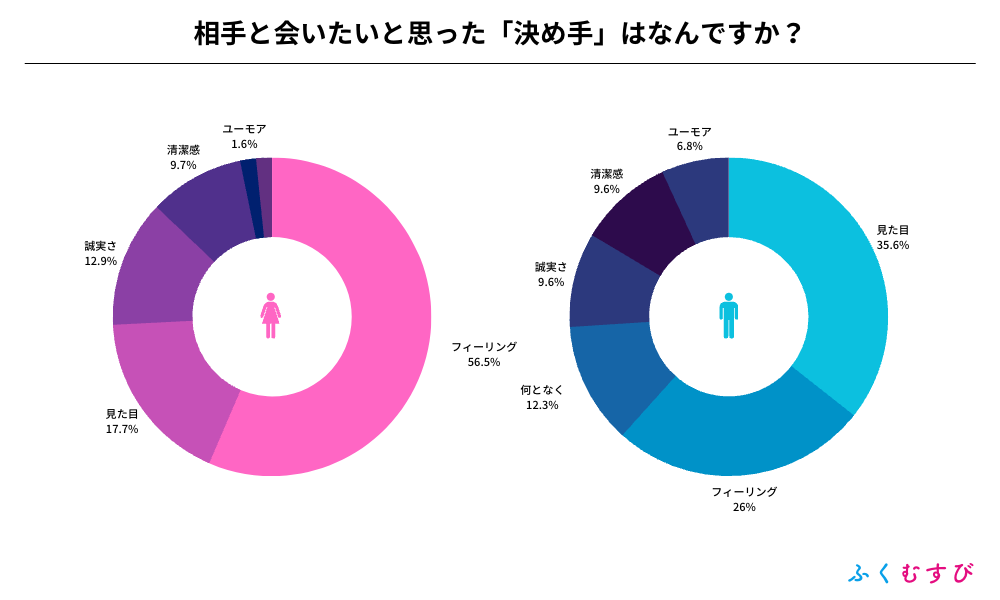 ・実際に会いたいと思った「決め手」の1位は、男性は見た目、女性はフィーリングでした。