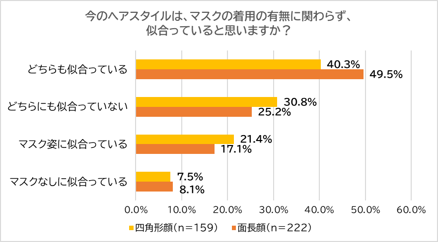 続いて「ショート」または「ボブ」と回答した381人に、「今のヘアスタイルは、マスク姿の自分にも、マスクを付けていない自分にも似合っていると思いますか?」と尋ねたところ、「どちらも似合っている」(四角形顔:40.3%、面長顔:49.5%)が共に最も多く、以下「どちらも似合っていない」(四角形顔:30.8%、面長顔:25.2%)、「マスク姿に似合っている」(四角形顔:21.4%、面長顔:17.1%)、「マスクなしに似合っている」(四角形顔:7.5%、面長顔:8.1%)となりました。約半数の人が、今のヘアスタイルはマスクを取ると自分に似合っていないと思っているようです。