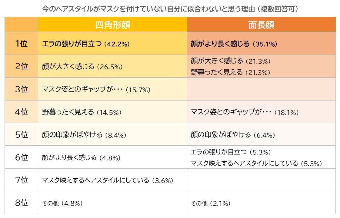 「どちらも似合っていない」または「マスク姿に似合っている」と回答した177人は、なぜ「マスクを付けていない自分には似合わない」と思っているのでしょうか?四角形顔は「エラの張りが目立つ」(42.2%、面長顔:5.3%)、面長顔は「顔がより長く感じる」(35.1%、四角形顔:4.8%)が最多となりました。マスクを付けていないことで、それぞれの顔の形のウィークポイントが目立ってしまうことが大きな原因であることがわかりました。