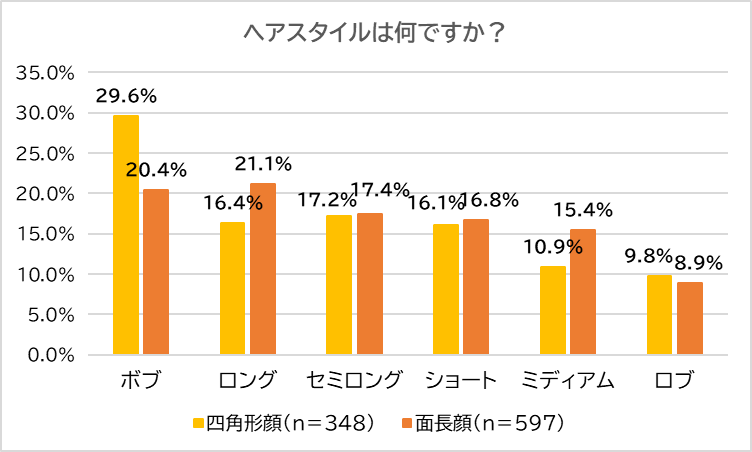 「面長顔」または「四角形顔」と回答した945人に、「ヘアスタイルは何か?」尋ねました。四角形顔では「ボブ」(23.8%、面長顔:20.4%)、面長顔では「ロング」(21.1%、四角形顔:16.4%)が最多となりました。また、四角形顔では他のヘアスタイルに比べ「ボブ」が多いですが、面長顔は「(肩から鎖骨につくかつかないかくらいの長さの)ロブ」以外のヘアスタイルに大差はありませんでした。