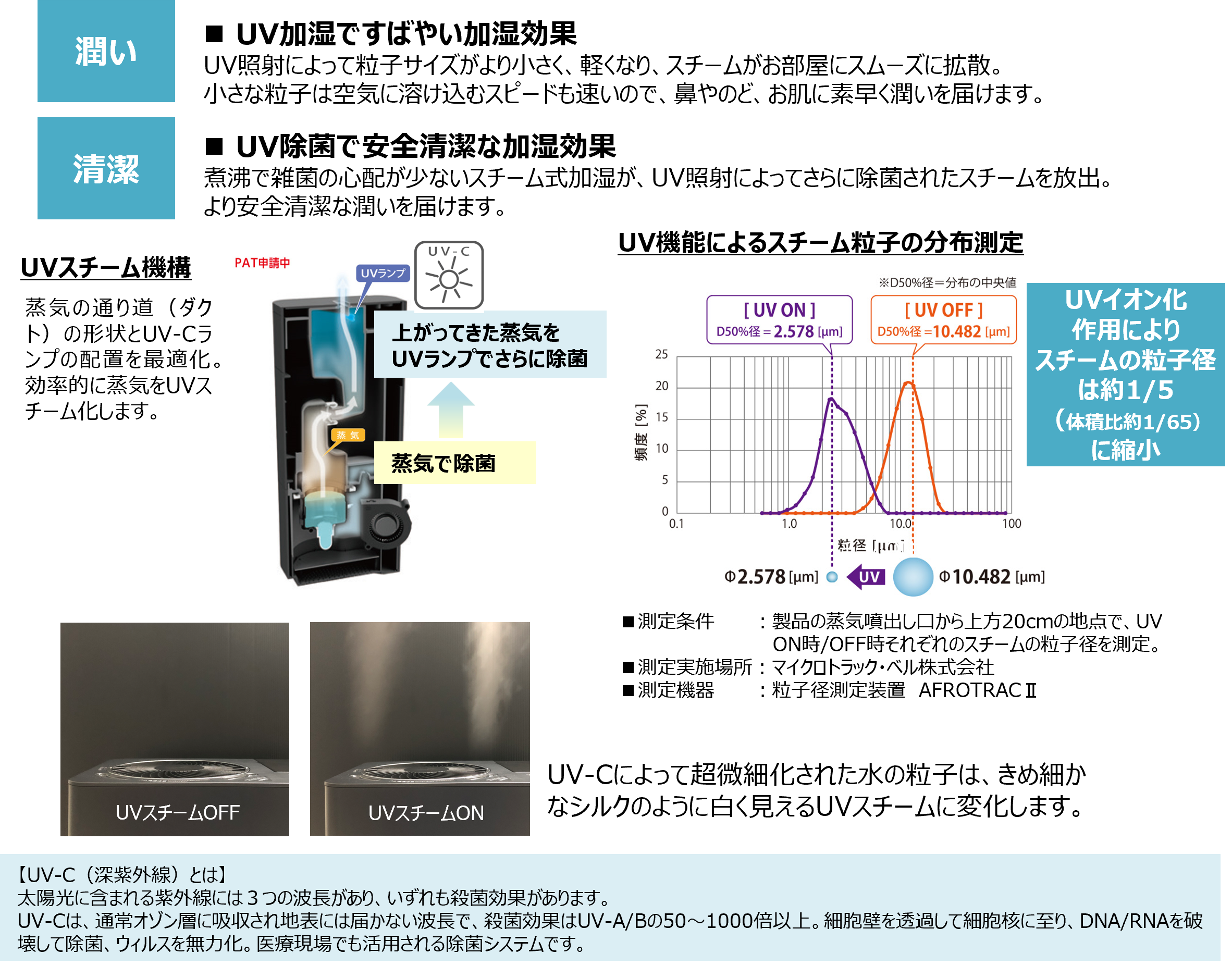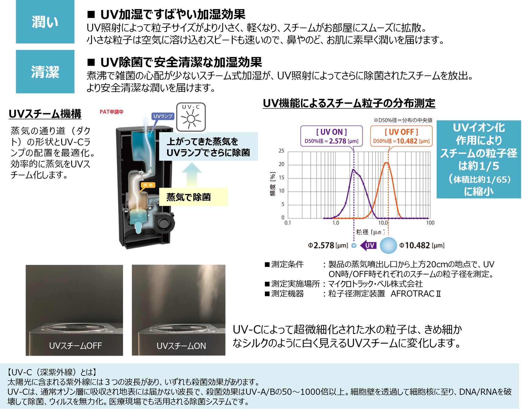 スチーム式加湿器が作り出す湿った空気(水蒸気)には無数の微細な水の粒子が含まれていますが、この水蒸気にUV-C(深紫外線)を照射すると水の粒子が超微細化します。超微細化した水粒子を含む「UVスチーム」は無色透明な水蒸気に対して、きめ細かなシルクのように白くはっきりと視認できます。超微細化した水粒子は素早くお部屋の空気に溶け込み、部屋中をスピーディー加湿し、またスチーム式の煮沸による除菌とUV-Cによる「W除菌」により従来にない衛生的な加湿を実現します。