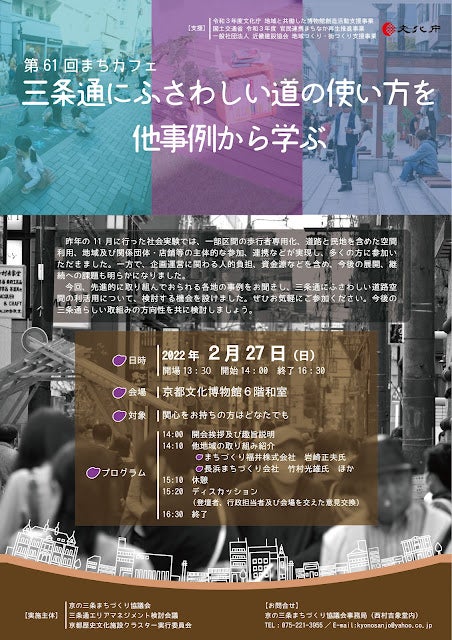 寺町通から新町通までの7町内から構成される「京の三条まちづくり協議会」では、「電線地中化・無電柱化」を進めるにあたり、道路や街灯などの検討、さらには、ポストパンデミックを見据え、日常の暮らしにおけるみちの活用の在り方についても検討しているところです。