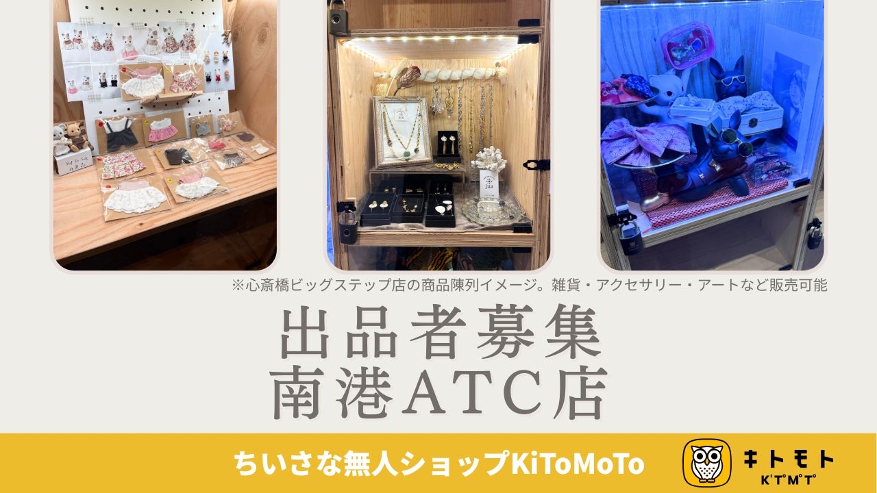 アタラキシアDX株式会社(本社:大阪市北区、以下「当社」)は、スマートロックを活用した無人販売プラットフォーム「KiToMoTo(キトモト)」の新店舗である南港ATC店のオープンに向けて、ハンドメイド作家、個人事業者の皆さまからの出品募集を開始しました。2026年1月14日より出品者は商品設置が可能になります。