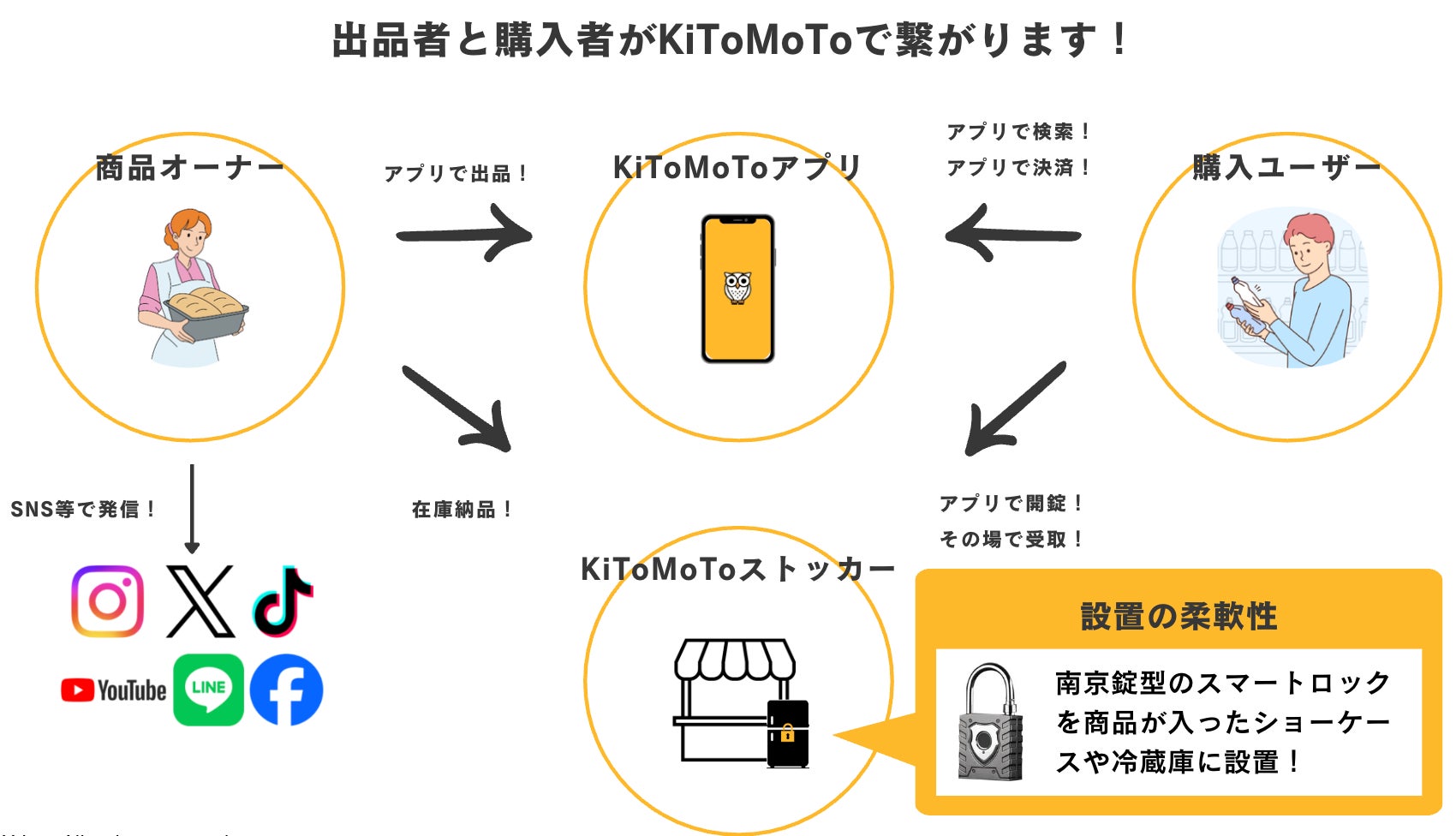 KiToMoTo(キトモト)は、出品者・設置場所オーナー・購入者の3者をつなぐ、手軽に始められる“小さな無人ショップ”のプラットフォームです。設置場所の管理から決済、在庫確認までをアプリで完結でき、スマートロックを組み合わせることで、安全かつスムーズな取引を実現します。