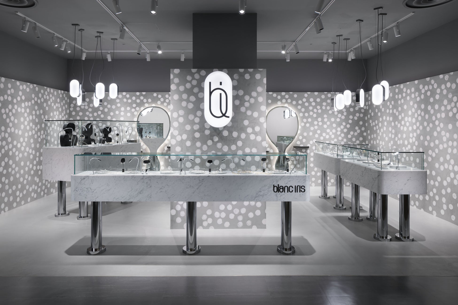 「BLANC IRIS NAGOYA 」では、イタリア人デザイナーで家具・食器をはじめインテリアデザインや建築などで世界的人気を誇るパオラ・ナヴォーネにインテリアデザインを依頼。グレーのカラーをベースにドットモチーフが印象的なお店とモダンなジュエリーが融合したスペシャルな空間です。