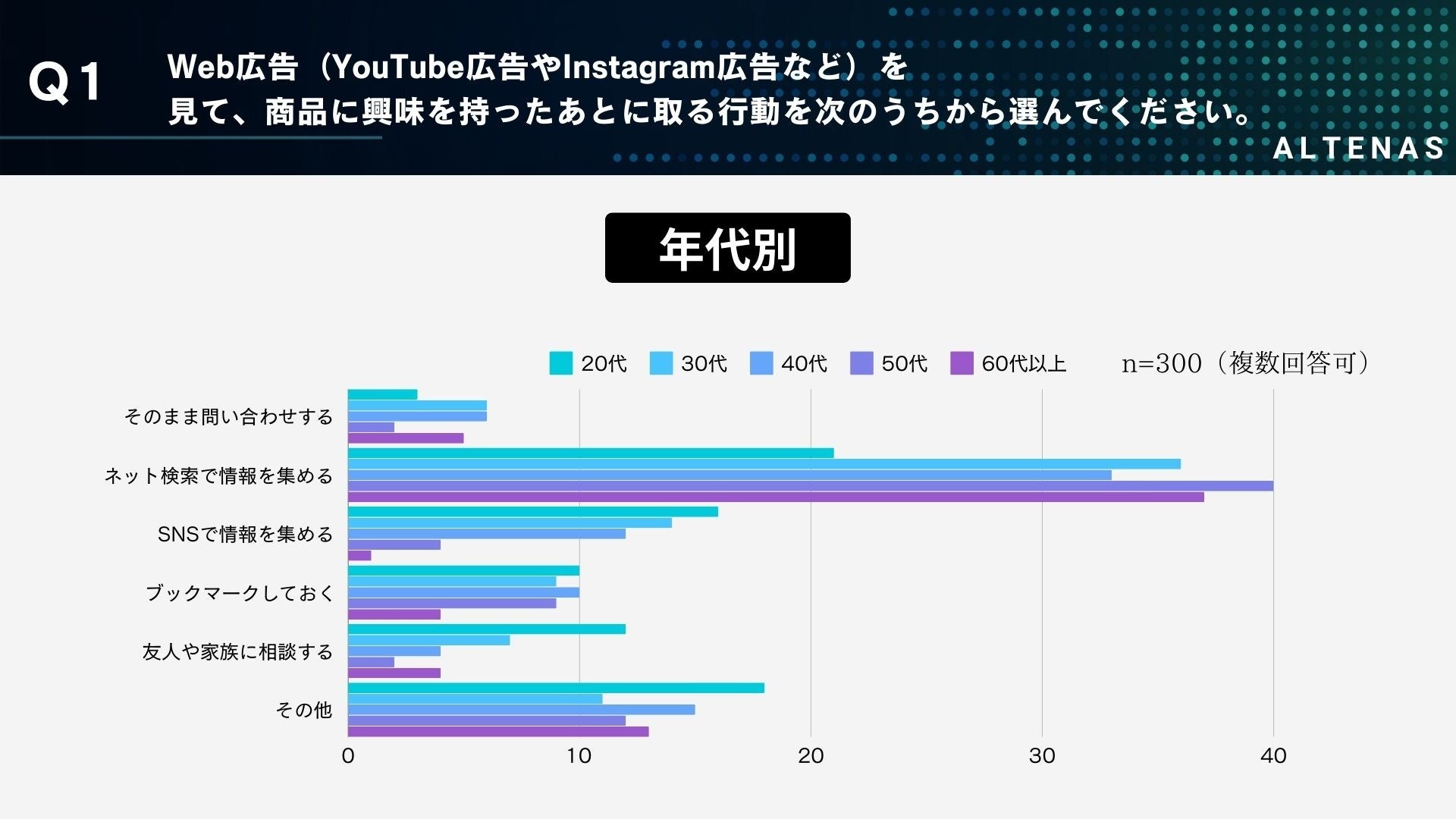 アルテナ株式会社(本社:愛知県名古屋市中区大須2-10-45 大須ステーションプラザ4階)は、「デジタルメディアにおける消費者行動調査」として、Web広告の影響力や消費者の情報収集方法の変化など、消費者行動のトレンドを把握すべく、「Web広告(SNS広告含む)を見て商品に興味をもったあとに取る次の行動」についてインターネット調査を行いました。