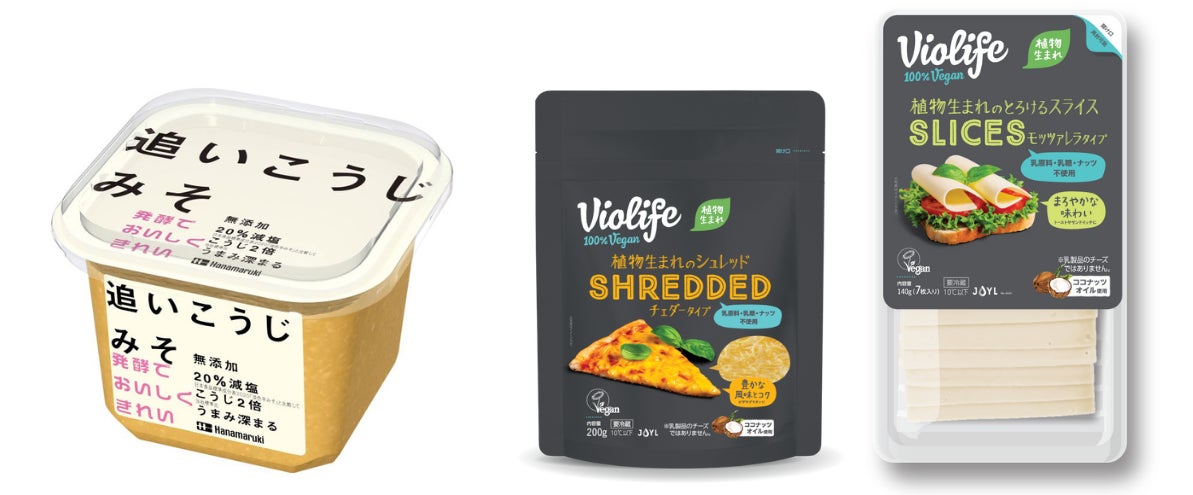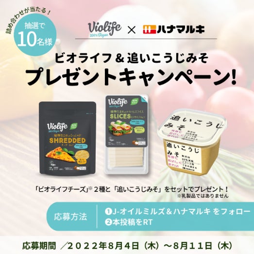 また、Twitterキャンペーンの期間は、8月4日(木)~8月11日(木)まで。期間中、両社のTwitter公式アカウントをフォロー&リツイートした方の中から抽選で10名様に、『ハナマルキ:無添加減塩 追いこうじみそ 650g』、『ビオライフ:植物生まれのとろけるスライス モッツァレラタイプ 140g』、『ビオライフ:植物生まれのシュレッド チェダータイプ 200g』の3点セットをプレゼントします。