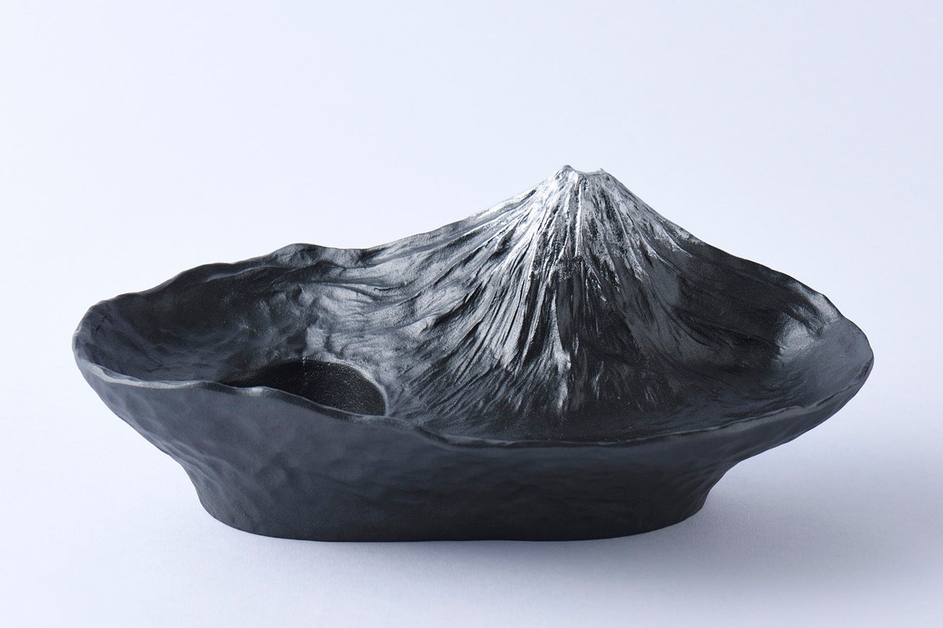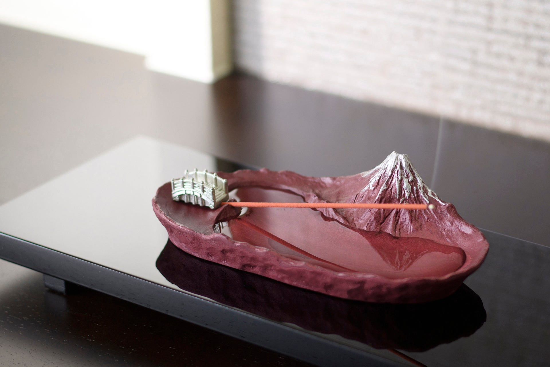 水を張ると、さかさ富士が水面に映る香立て。お香の煙を雲海に見立てる。