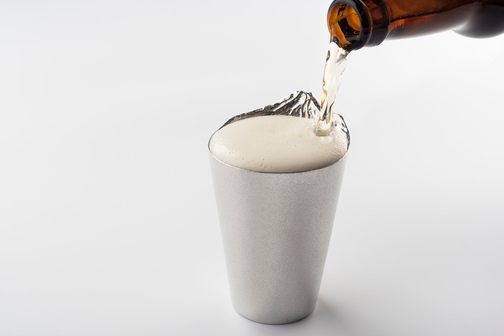 ビールを注いだときの「泡」を雲海に見立てた錫製グラス。350ml缶で数回雲海風景を楽しめます。