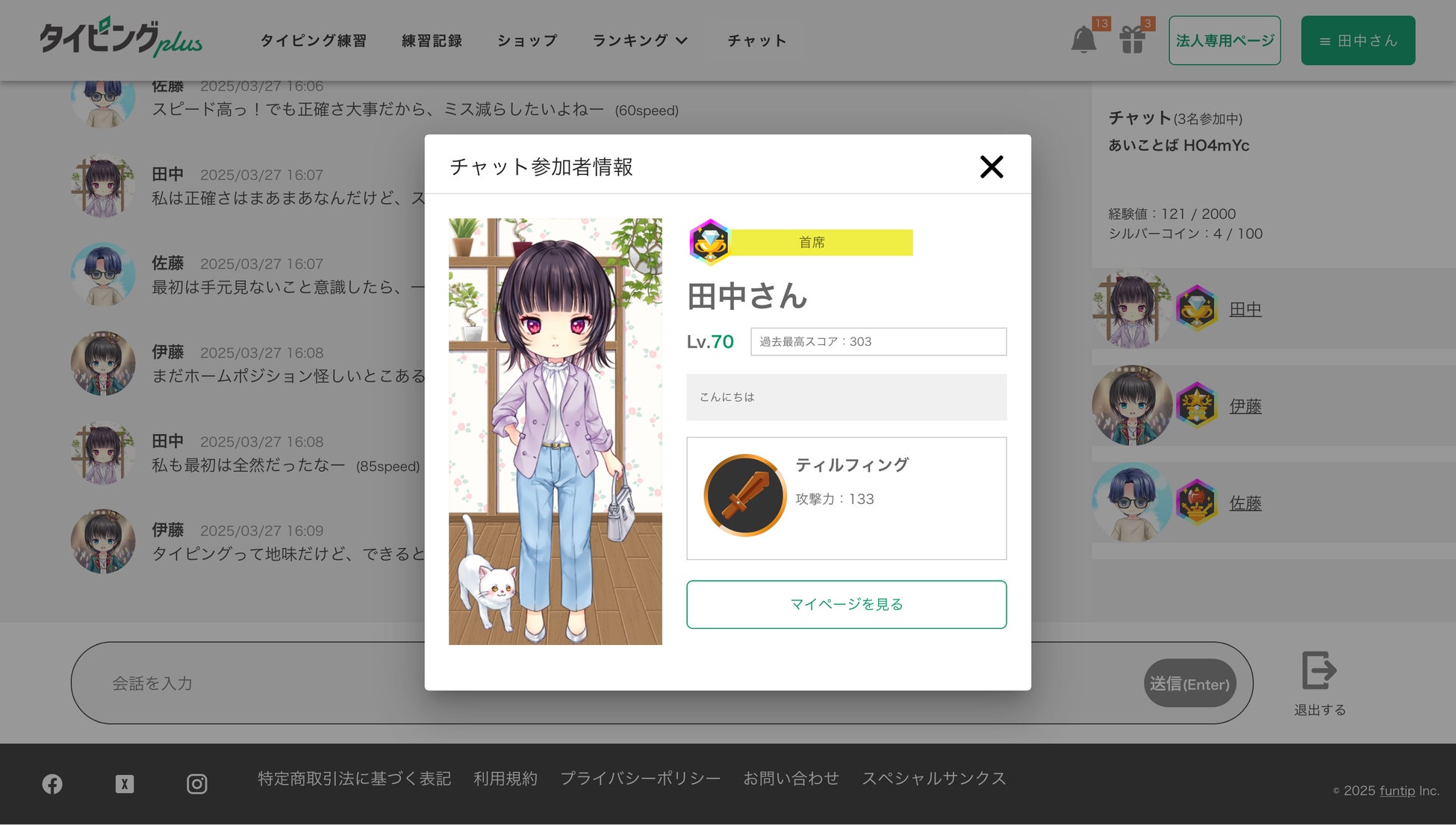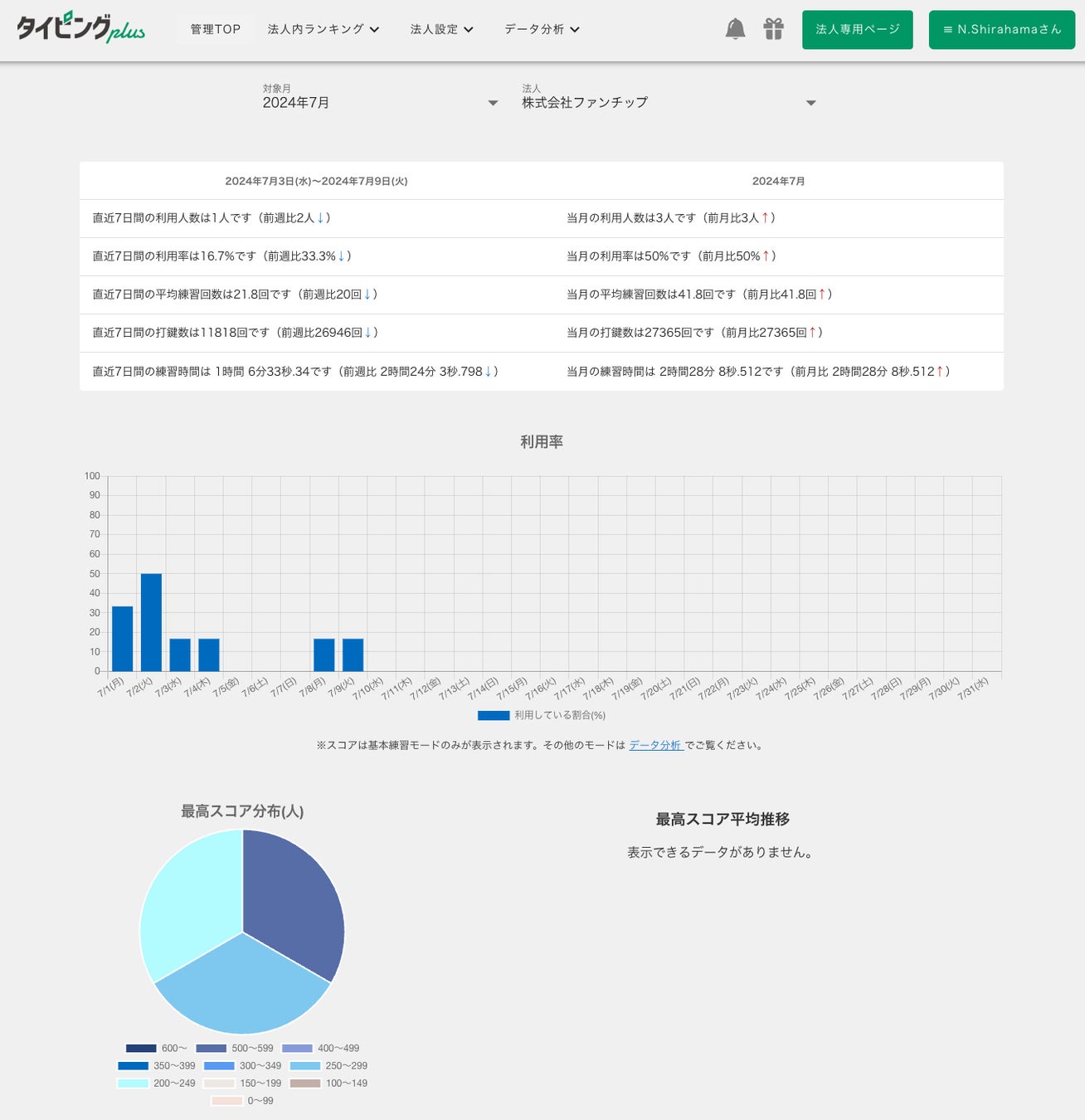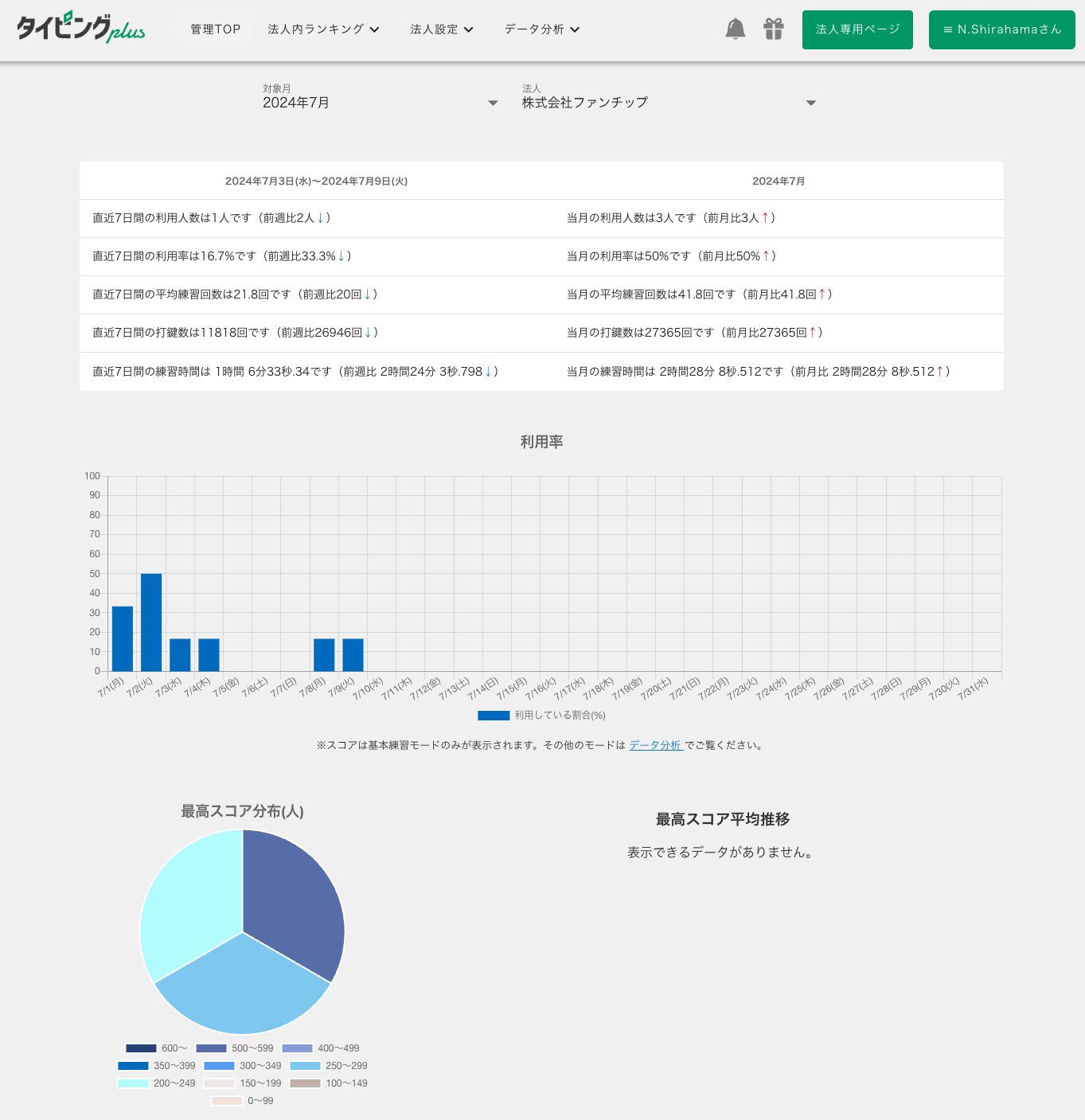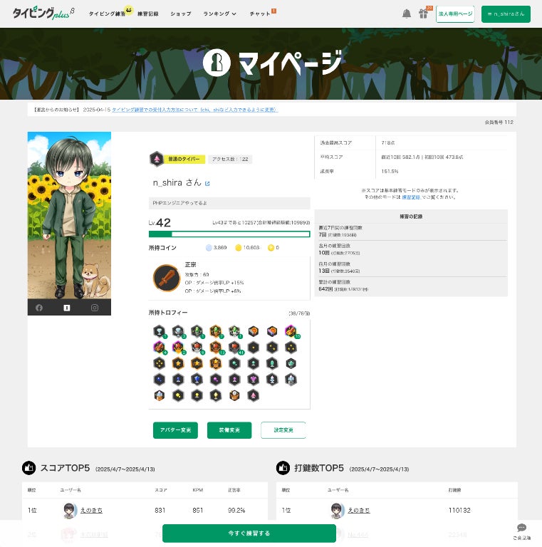 管理者用のダッシュボードでは、利用人数・平均練習回数・スコア分布・前月比などの統計データを自動集計。生徒や社員一人ひとりの練習履歴・成果を可視化でき、効果的な研修運営が可能です。また、利用者は自分のレベル・武器・スコアをマイページで確認でき、他の利用者とチャットで交流しながらモチベーションを維持できます。法人プランではチャットの利用制限オプションもあります。