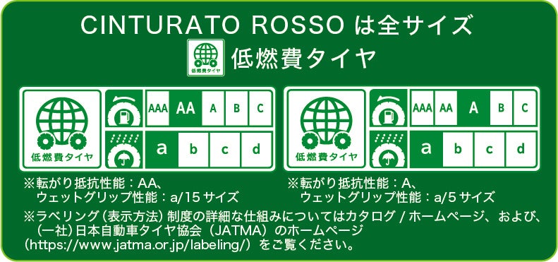 また、Cinturato ROSSOは、日本自動車タイヤ協会(JATMA)のウェットグリップ指標の最高グレードであるラベリングaを全サイズで取得しています。さらに、環境にも配慮してJATMAの転がり抵抗のラベリングAA/Aを取得しています。これにより、排気ガスを削減するとともに車の燃費向上にも貢献しています。