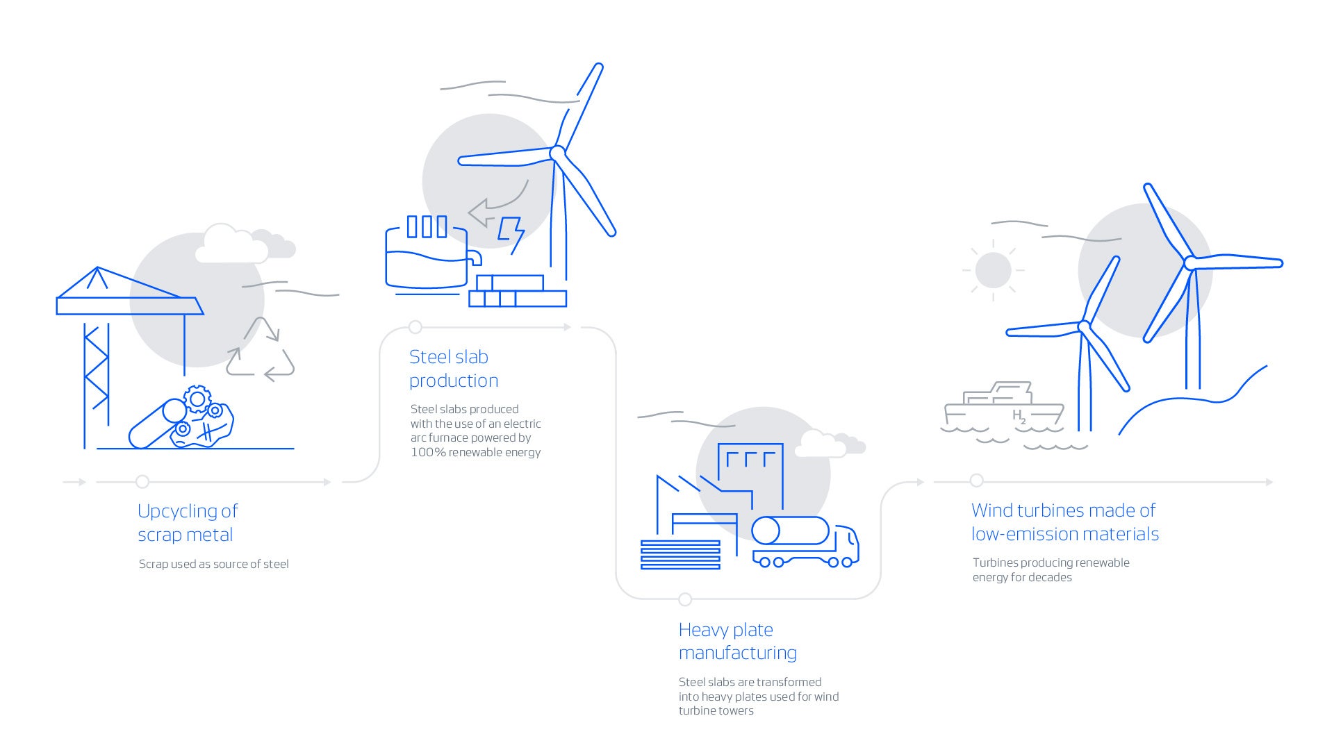 洋上タワーの上部2セクションに低排出スチールを使用することにより、従来の工程で製造されたスチールを用いたタワーと比較して、約25%の排出量削減に相当します。陸上タワー全体に使用した場合には、CO2削減率は少なくとも52%になります。