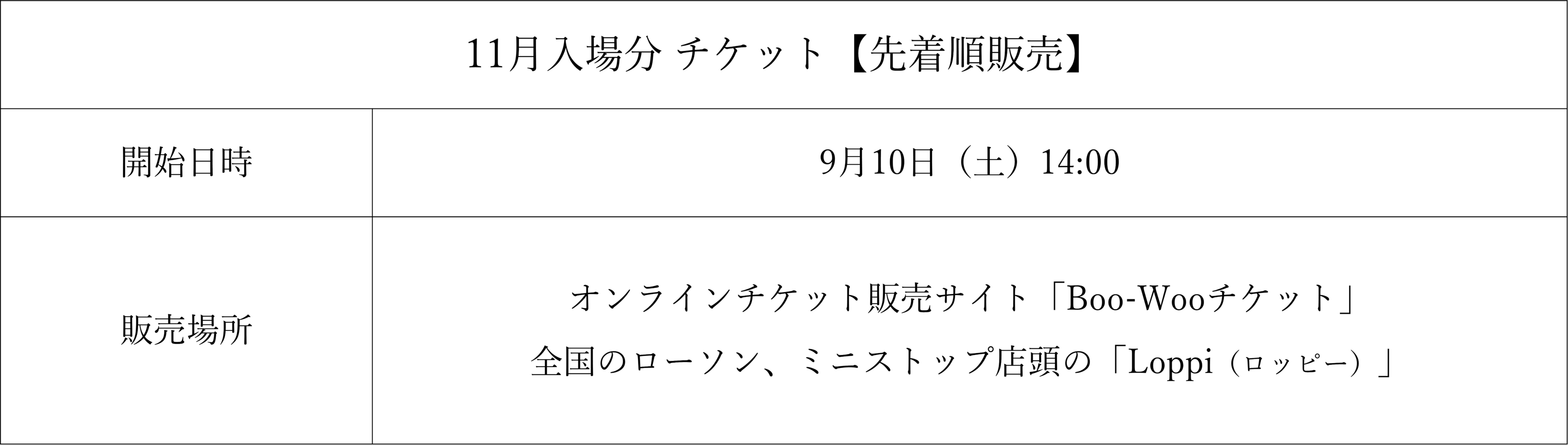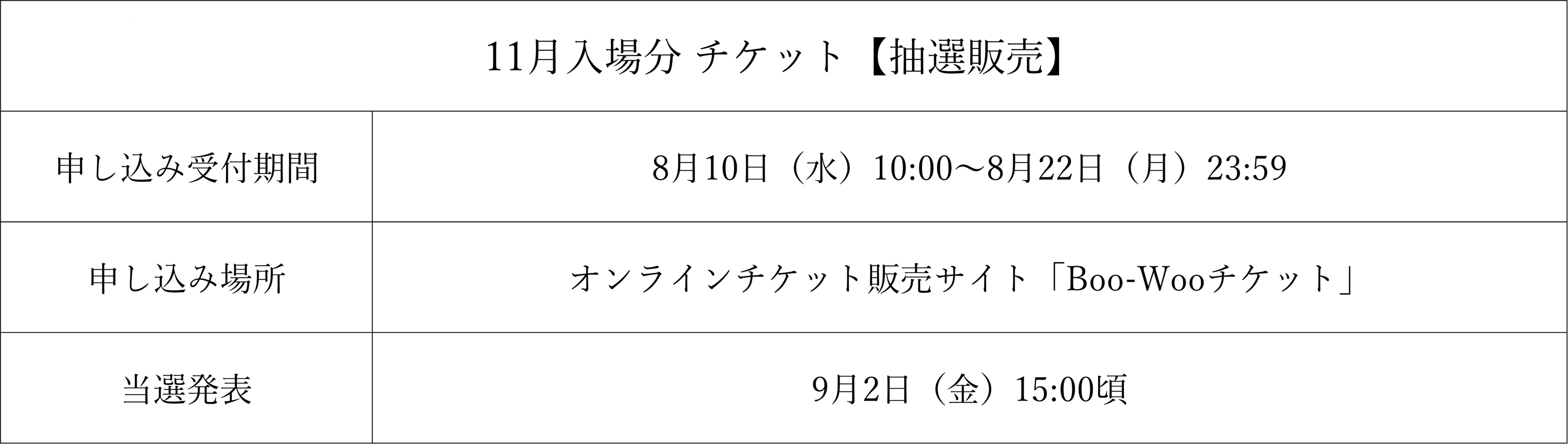 11月入場分のチケット抽選販売が8月10日(水)10:00、オンラインチケット販売サイト「Boo(ブー)-Woo(ウー)チケット」で始まります。申し込み期間は8月22日(月)23:59までです。