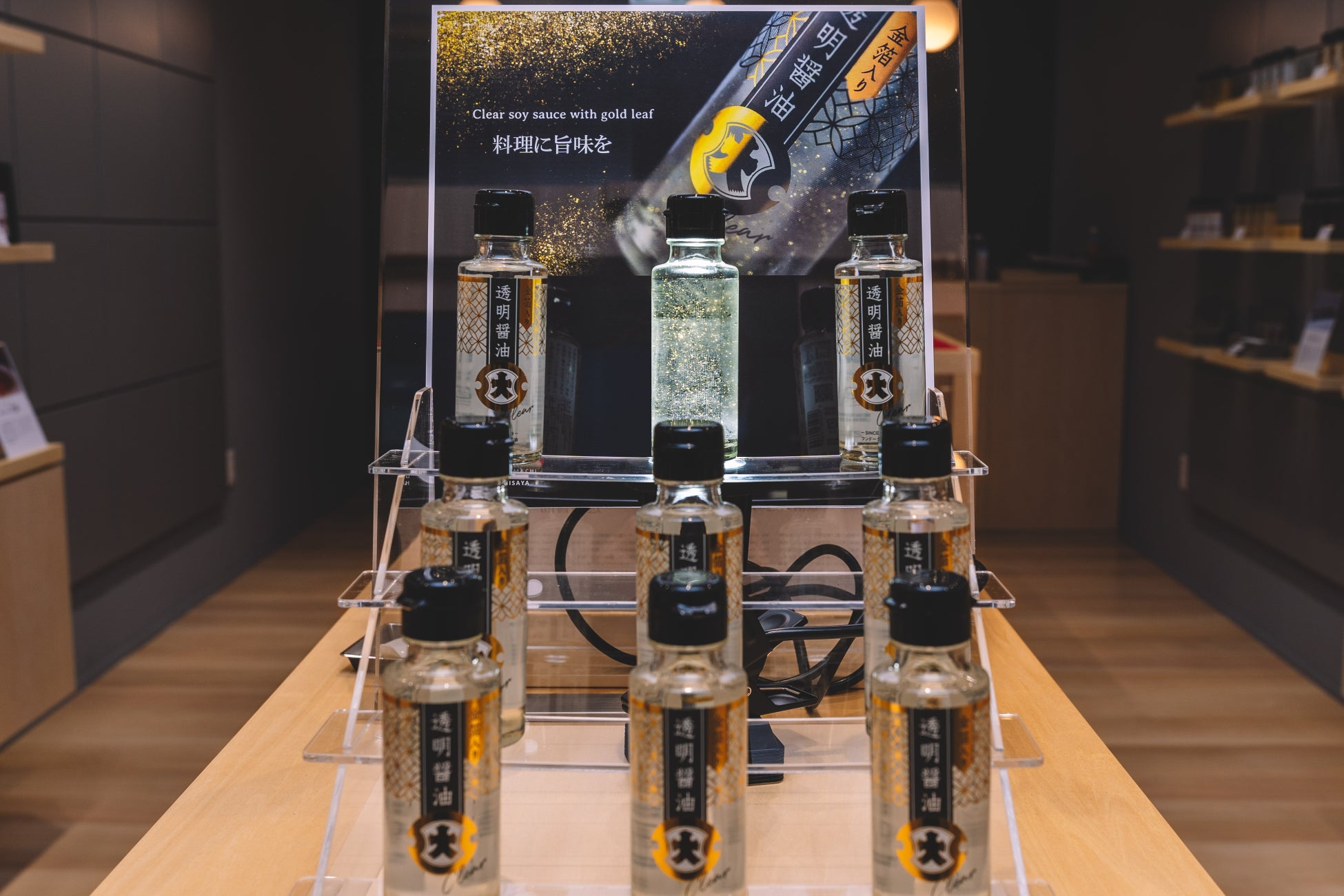 金箔入り透明醤油:醤油の味わいはそのままに、自社製法でつくった透明なお醤油。華やかな彩りを添える金箔を加えました。 素材の色を最大限に活かす、具材も服も汚さない新感覚の醤油です。