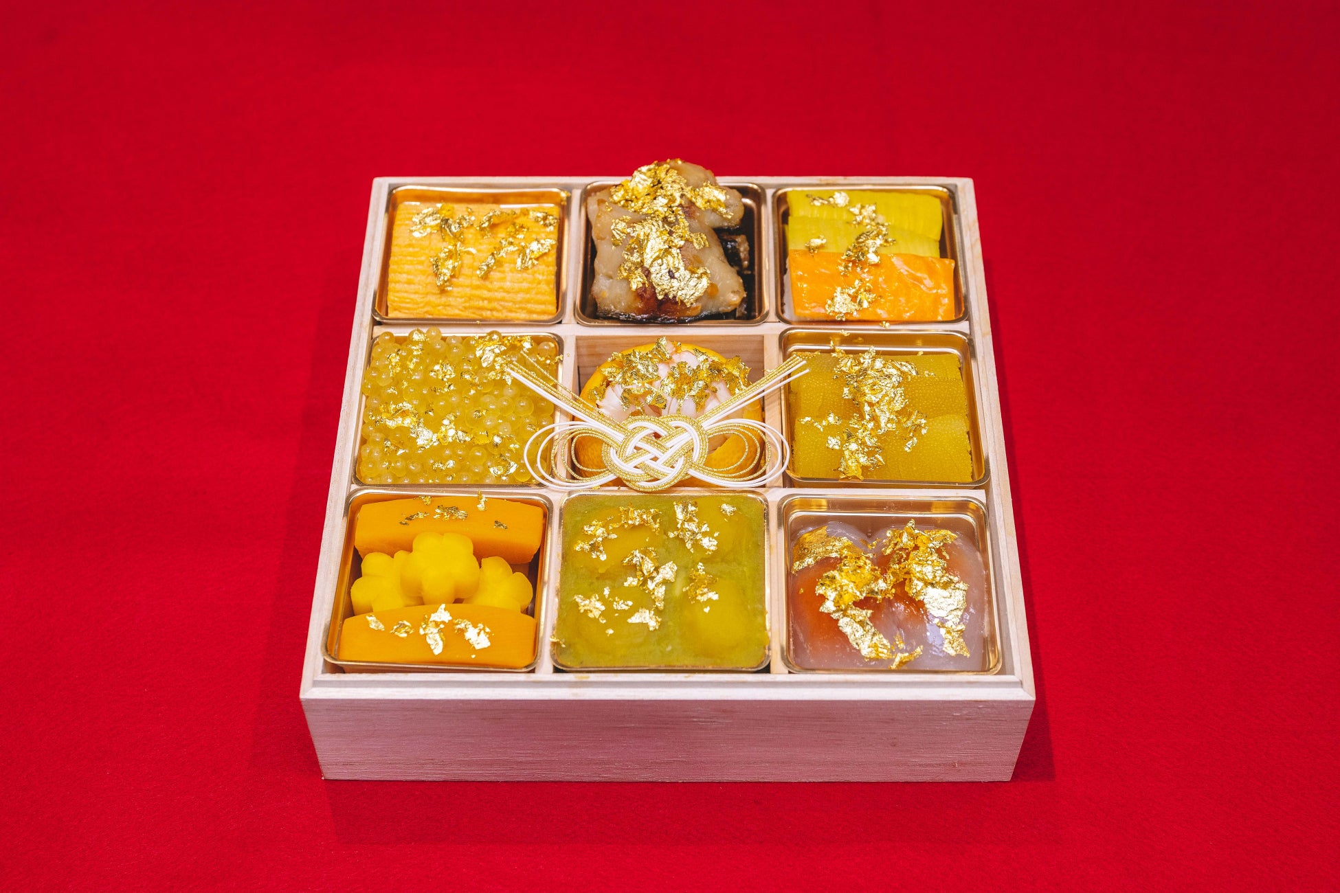 金のいくら(ヤマメ卵)、金の出汁巻き卵、金の数の子、金のねじり梅人参、金の栗きんとん、金の蟹入り柚子釜、金の西京焼、金の筍、金箔入り水饅頭(金柑甘露煮)、金の紋甲いかろう焼き、金の南京