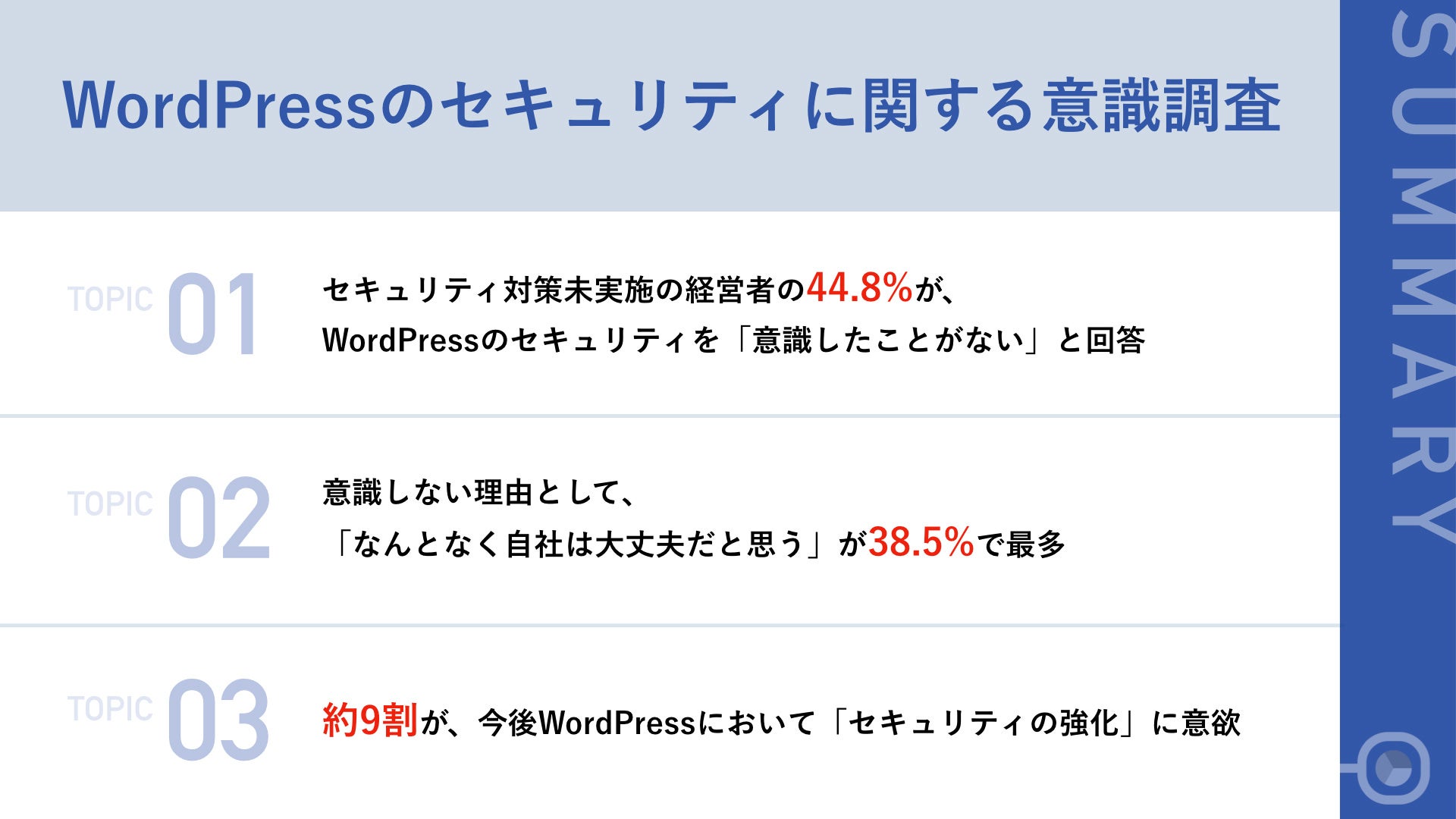 - セキュリティ対策未実施の経営者の44.8%が、WordPressのセキュリティを「意識したことがない」と回答