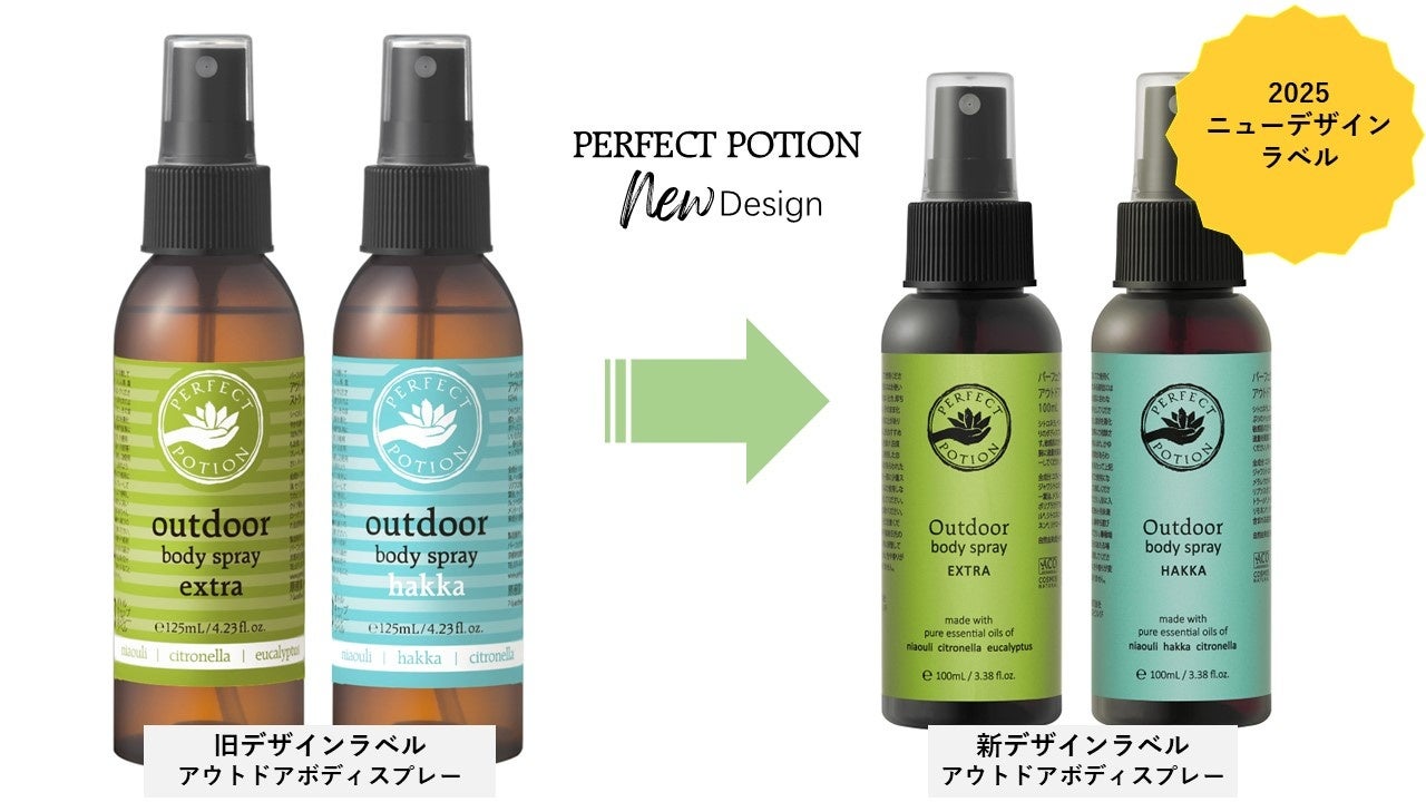 パーフェクトポーションでは、2019年頃よりラベルのデザイン変更を進めており、その一環として、この2025年シーズンより、「アウトドアボディスプレー エクストラ」と「アウトドアボディスプレー ハッカ」のラベルデザインもパーフェクトポーションNEWデザインへとアップデートしました。