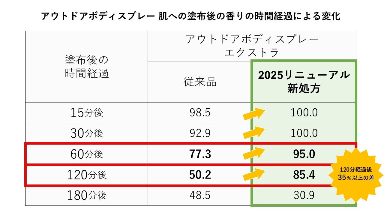 第三者機関による「アウトドアボディスプレー エクストラ」を使用した試験※4において、60分経過後の結果の比較では、従来品の「アウトドアボディスプレー エクストラ」が、時間の経過に伴い香りが約23%低減していることに対し、新処方の「アウトドアボディスプレー エクストラ」は、香りが5%しか低減しておらず、香りが長持ちしています。