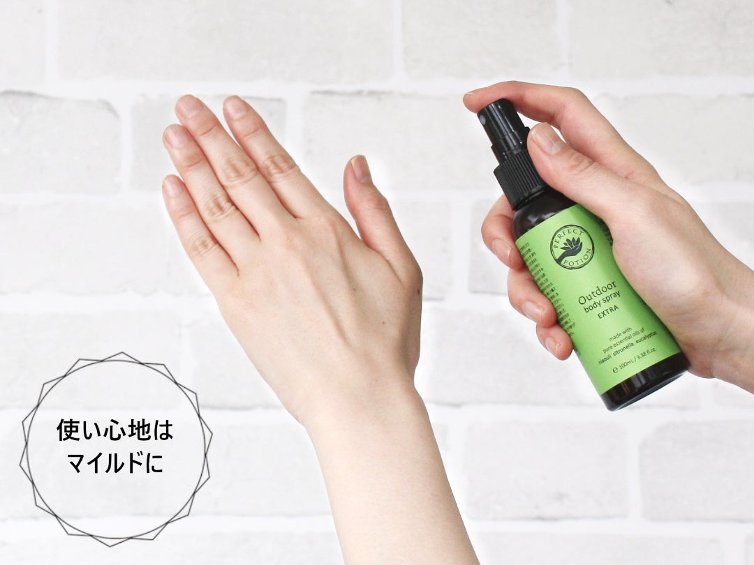 パーフェクトポーションのアウトドアボディスプレーは、年齢によって使用制限のあるDEET※8は使用しておりません。