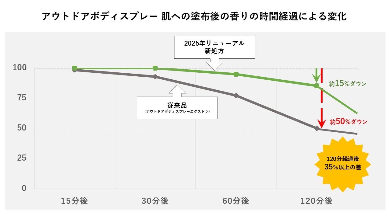 さらに、120分経過後の結果の比較でも、従来品の「アウトドアボディスプレー エクストラ」が、約50%低減していることに対し、新処方の「アウトドアボディスプレー エクストラ」は、120分経過後でも香りが約15%しか低減しておらず、35%以上の差をつけて、香りが長持ちしています。